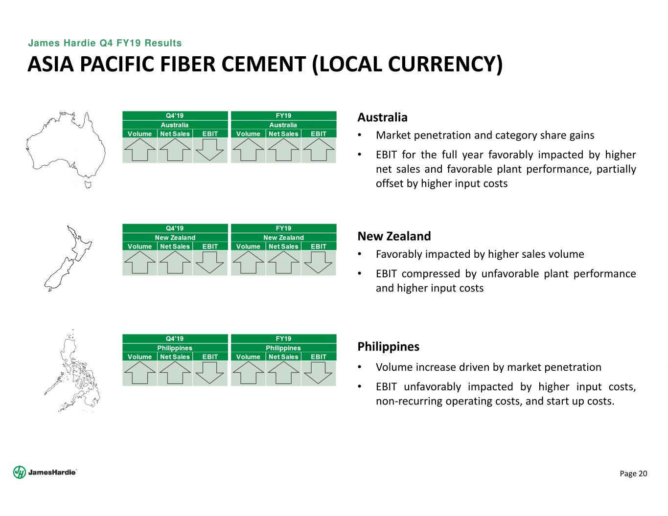 James Hardie Q4 FY19 Results ASIA PACIFIC FIBER CEMENT SUMMARY Q4'19 FY19 Volume 129.9 mmsf 546.1 mmsf • Strong volume growth above market index in Australia Sales Volume 7% 10% and Philippines A$143.6 M A$612.2 M • Market penetration and category share gains, despite a Net Sales 7% 11% softening market A$984 per msf A$992 per msf EBIT Average Price 1% 1% • Higher net sales and strong volume performance US$20.5 M US$99.8 M • Inflationary input cost environment US$ EBIT 22% 8% • Segment results in US dollars impacted by unfavorable A$28.8 M A$136.5 M foreign exchange rate movements A$ EBIT 14% 2% Page 19