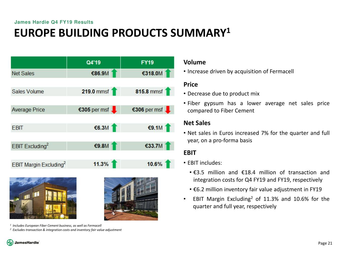 James Hardie Q4 FY19 Results ASIA PACIFIC FIBER CEMENT (LOCAL CURRENCY) Australia • Market penetration and category share gains • EBIT for the full year favorably impacted by higher net sales and favorable plant performance, partially offset by higher input costs New Zealand • Favorably impacted by higher sales volume • EBIT compressed by unfavorable plant performance and higher input costs Philippines • Volume increase driven by market penetration • EBIT unfavorably impacted by higher input costs, non-recurring operating costs, and start up costs. Page 20