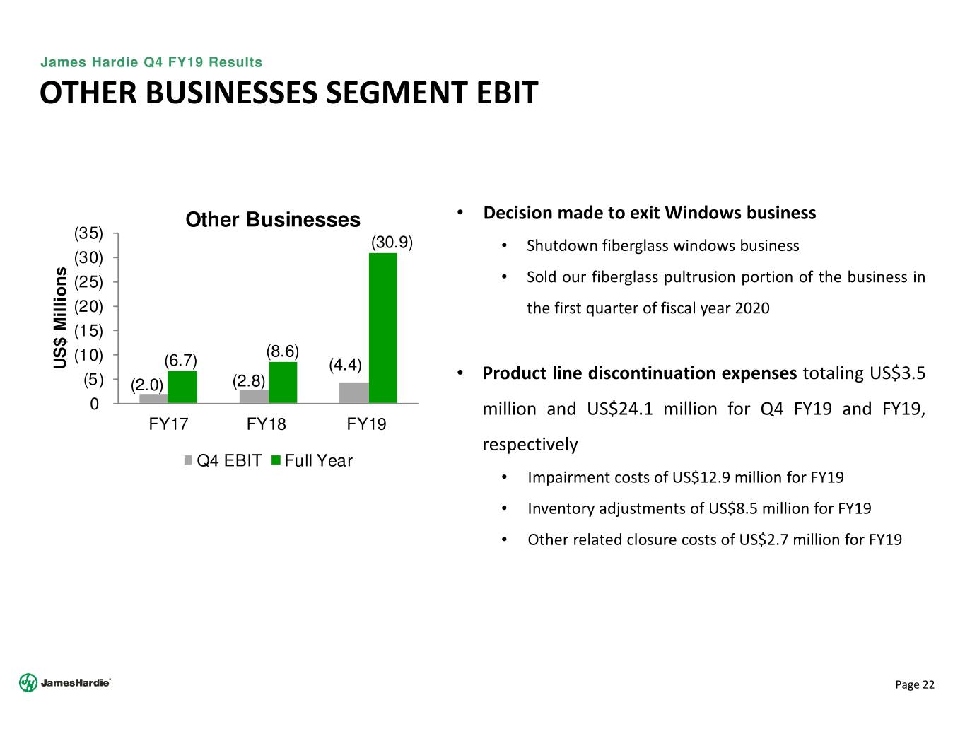 James Hardie Q4 FY19 Results EUROPE BUILDING PRODUCTS SUMMARY 1 Volume • Increase driven by acquisition of Fermacell Price • Decrease due to product mix • Fiber gypsum has a lower average net sales price compared to Fiber Cement Net Sales • Net sales in Euros increased 7% for the quarter and full year, on a pro-forma basis EBIT • EBIT includes: • €3.5 million and €18.4 million of transaction and integration costs for Q4 FY19 and FY19, respectively • €6.2 million inventory fair value adjustment in FY19 • EBIT Margin Excluding 2 of 11.3% and 10.6% for the quarter and full year, respectively 1 Includes European Fiber Cement business, as well as Fermacell 2 Excludes transaction & integration costs and inventory fair value adjustment Page 21