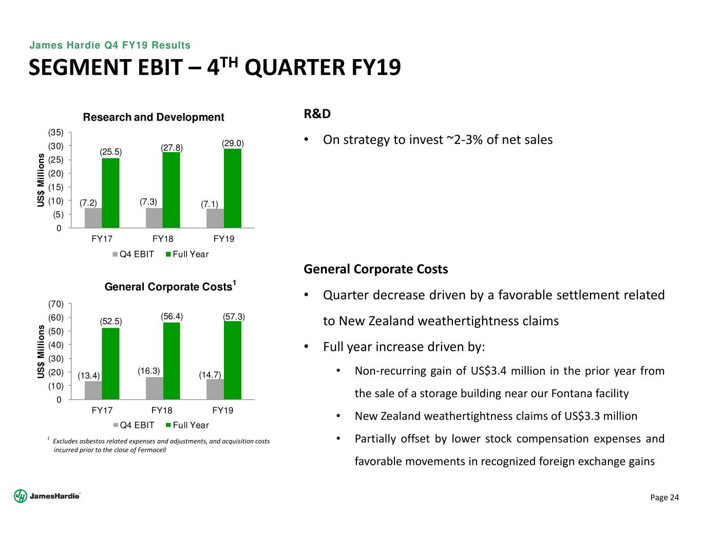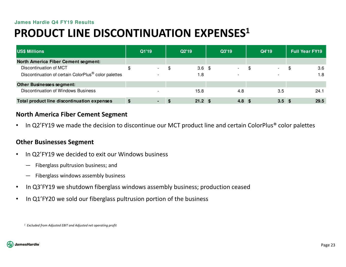 James Hardie Q4 FY19 Results PRODUCT LINE DISCONTINUATION EXPENSES 1 US$ Millions Q1'19 Q2'19 Q3'19 Q4'19 Full Year FY19 North America Fiber Cement segment: Discontinuation of MCT $ - $ 3.6 $ - $ - $ 3.6 Discontinuation of certain ColorPlus ® color palettes - 1.8 - - 1.8 Other Businesses segment: Discontinuation of Windows Business - 15.8 4.8 3.5 24.1 Total product line discontinuation expenses $ - $ 21.2 $ 4.8 $ 3.5 $ 29.5 North America Fiber Cement Segment • In Q2’FY19 we made the decision to discontinue our MCT product line and certain ColorPlus® color palettes Other Businesses Segment • In Q2’FY19 we decided to exit our Windows business ― Fiberglass pultrusion business; and ― Fiberglass windows assembly business • In Q3’FY19 we shutdown fiberglass windows assembly business; production ceased • In Q1’FY20 we sold our fiberglass pultrusion portion of the business 1 Excluded from Adjusted EBIT and Adjusted net operating profit 23 Page 23