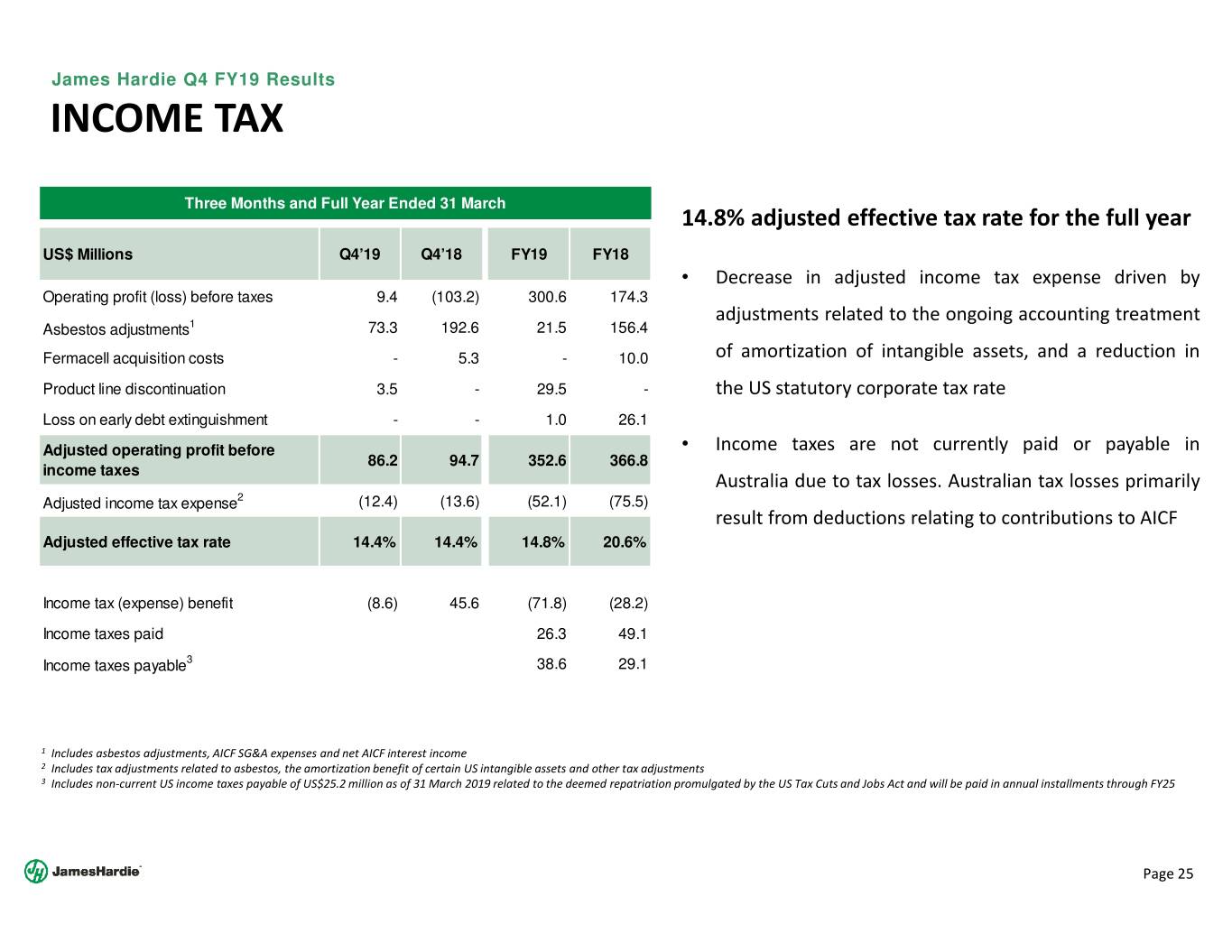 James Hardie Q4 FY19 Results INCOME TAX Three Months and Full Year Ended 31 March 14.8% adjusted effective tax rate for the full year US$ Millions Q4’19 Q4’18 FY19 FY18 • Decrease in adjusted income tax expense driven by Operating profit (loss) before taxes 9.4 (103.2) 300.6 174.3 adjustments related to the ongoing accounting treatment Asbestos adjustments 1 73.3 192.6 21.5 156.4 Fermacell acquisition costs - 5.3 - 10.0 of amortization of intangible assets, and a reduction in Product line discontinuation 3.5 - 29.5 - the US statutory corporate tax rate Loss on early debt extinguishment - - 1.0 26.1 Adjusted operating profit before • Income taxes are not currently paid or payable in 86.2 94.7 352.6 366.8 income taxes Australia due to tax losses. Australian tax losses primarily Adjusted income tax expense 2 (12.4) (13.6) (52.1) (75.5) result from deductions relating to contributions to AICF Adjusted effective tax rate 14.4% 14.4% 14.8% 20.6% Income tax (expense) benefit (8.6) 45.6 (71.8) (28.2) Income taxes paid 26.3 49.1 Income taxes payable 3 38.6 29.1 1 Includes asbestos adjustments, AICF SG&A expenses and net AICF interest income 2 Includes tax adjustments related to asbestos, the amortization benefit of certain US intangible assets and other tax adjustments 3 Includes non-current US income taxes payable of US$25.2 million as of 31 March 2019 related to the deemed repatriation promulgated by the US Tax Cuts and Jobs Act and will be paid in annual installments through FY25 Page 25