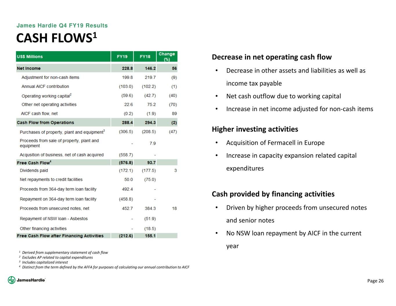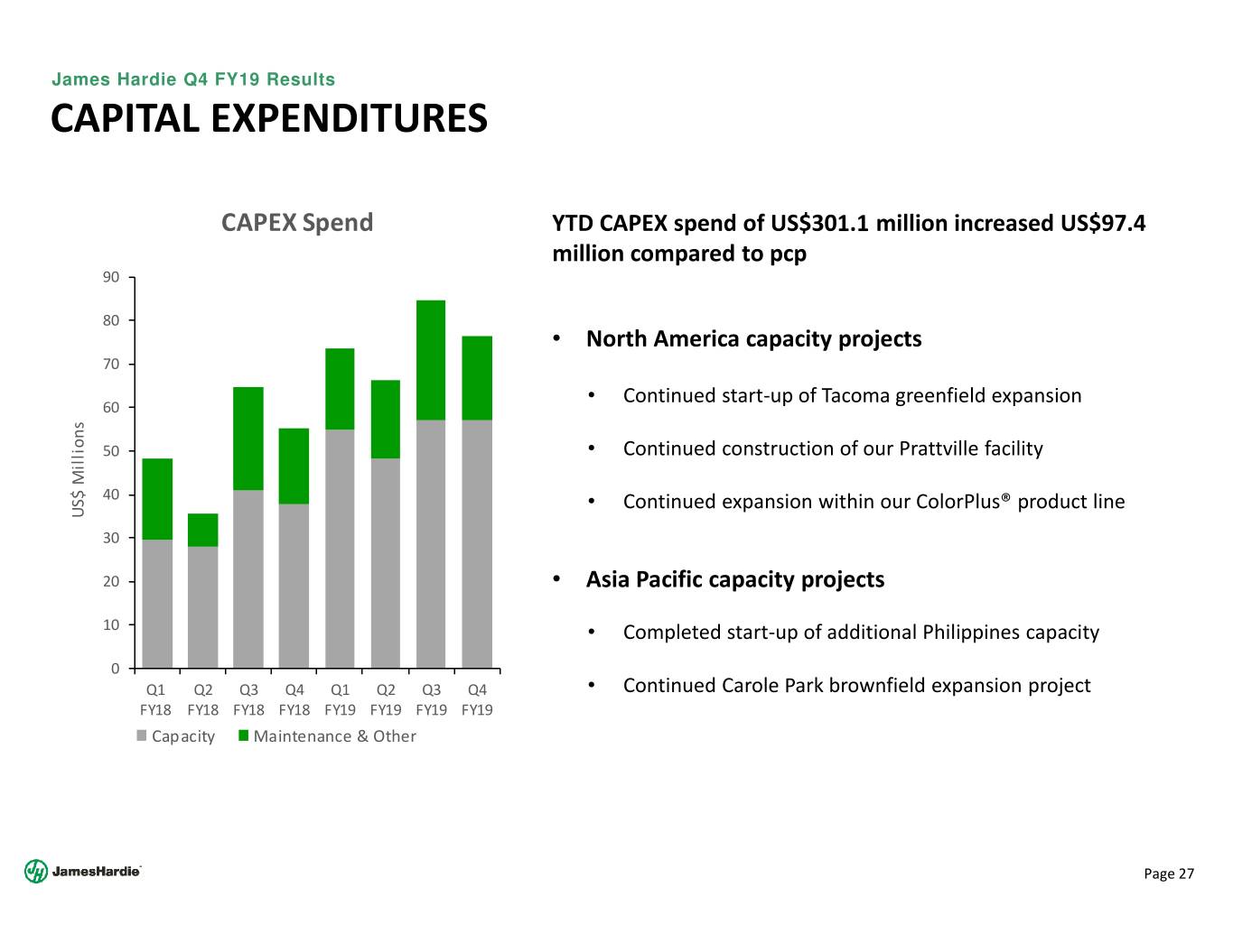 James Hardie Q4 FY19 Results CASH FLOWS 1 Decrease in net operating cash flow • Decrease in other assets and liabilities as well as income tax payable 1 • Net cash outflow due to working capital • Increase in net income adjusted for non-cash items Higher investing activities • Acquisition of Fermacell in Europe • Increase in capacity expansion related capital expenditures Cash provided by financing activities • Driven by higher proceeds from unsecured notes and senior notes • No NSW loan repayment by AICF in the current year 1 Derived from supplementary statement of cash flow 2 Excludes AP related to capital expenditures 3 Includes capitalized interest 4 Distinct from the term defined by the AFFA for purposes of calculating our annual contribution to AICF Page 26