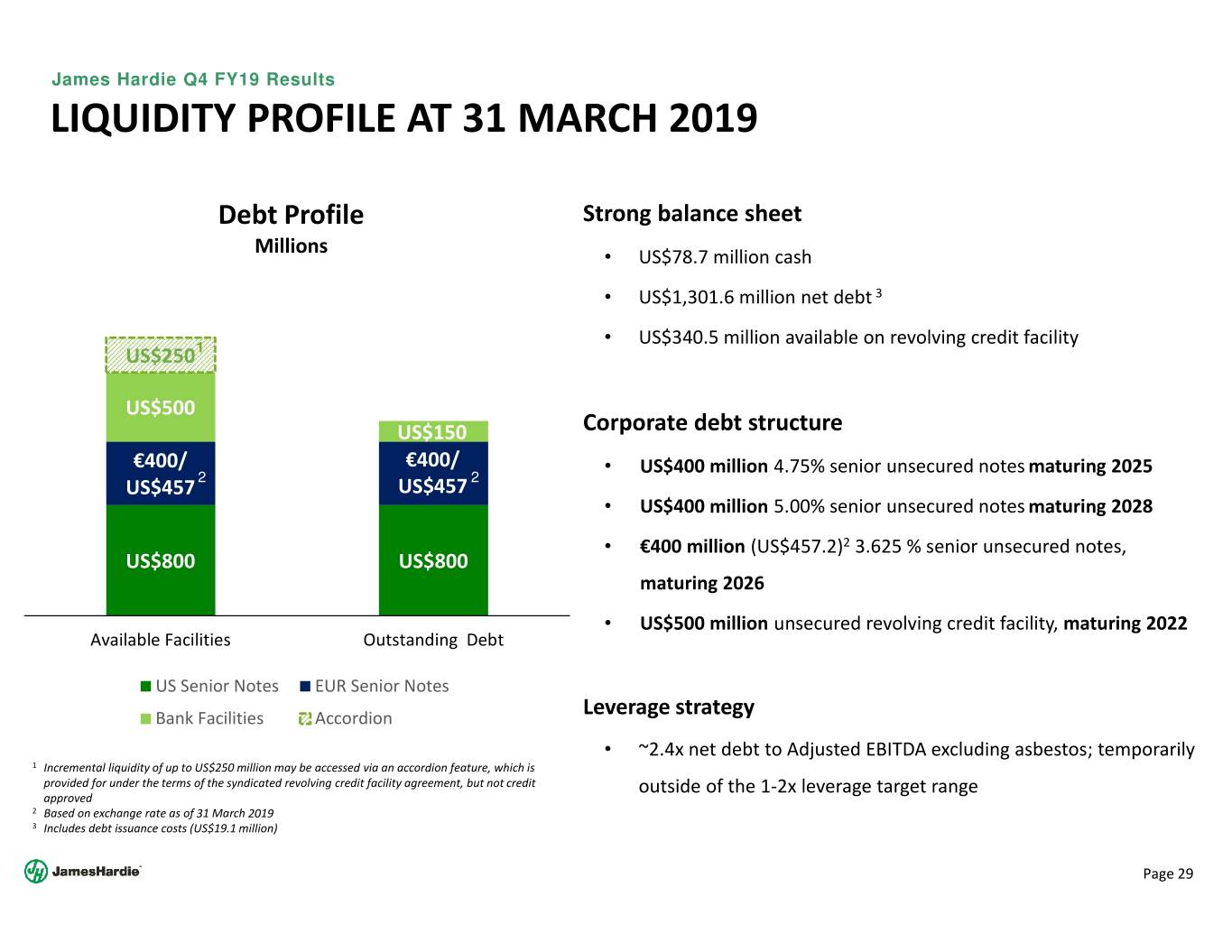 James Hardie Q4 FY19 Results LIQUIDITY PROFILE AT 31 MARCH 2019 Debt Profile Strong balance sheet Millions • US$78.7 million cash • US$1,301.6 million net debt 3 • US$340.5 million available on revolving credit facility US$250 1 US$500 US $150 Corporate debt structure €400/ €400/ • US$400 million 4.75% senior unsecured notes maturing 2025 US$457 2 US$457 2 • US$400 million 5.00% senior unsecured notes maturing 2028 • €400 million (US$457.2) 2 3.625 % senior unsecured notes, US$800 US$800 maturing 2026 • US$500 million unsecured revolving credit facility, maturing 2022 Available Facilities Outstanding Debt US Senior Notes EUR Senior Notes Bank Facilities Accordion Leverage strategy • ~2.4x net debt to Adjusted EBITDA excluding asbestos; temporarily 1 Incremental liquidity of up to US$250 million may be accessed via an accordion feature, which is provided for under the terms of the syndicated revolving credit facility agreement, but not credit outside of the 1-2x leverage target range approved 2 Based on exchange rate as of 31 March 2019 3 Includes debt issuance costs (US$19.1 million) Page 29