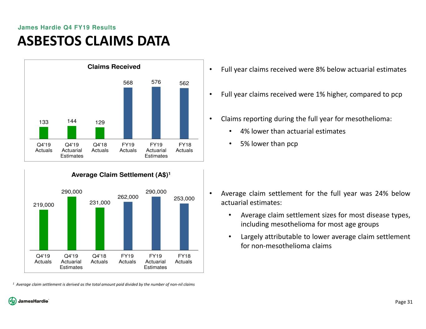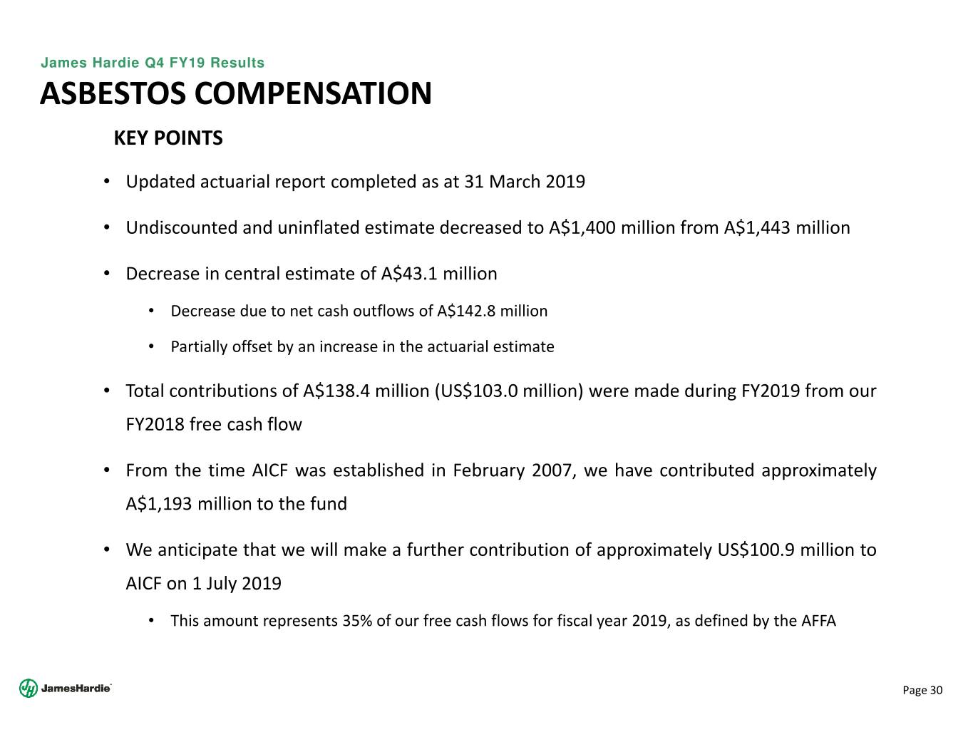 James Hardie Q4 FY19 Results ASBESTOS COMPENSATION KEY POINTS • Updated actuarial report completed as at 31 March 2019 • Undiscounted and uninflated estimate decreased to A$1,400 million from A$1,443 million • Decrease in central estimate of A$43.1 million • Decrease due to net cash outflows of A$142.8 million • Partially offset by an increase in the actuarial estimate • Total contributions of A$138.4 million (US$103.0 million) were made during FY2019 from our FY2018 free cash flow • From the time AICF was established in February 2007, we have contributed approximately A$1,193 million to the fund • We anticipate that we will make a further contribution of approximately US$100.9 million to AICF on 1 July 2019 • This amount represents 35% of our free cash flows for fiscal year 2019, as defined by the AFFA Page 30