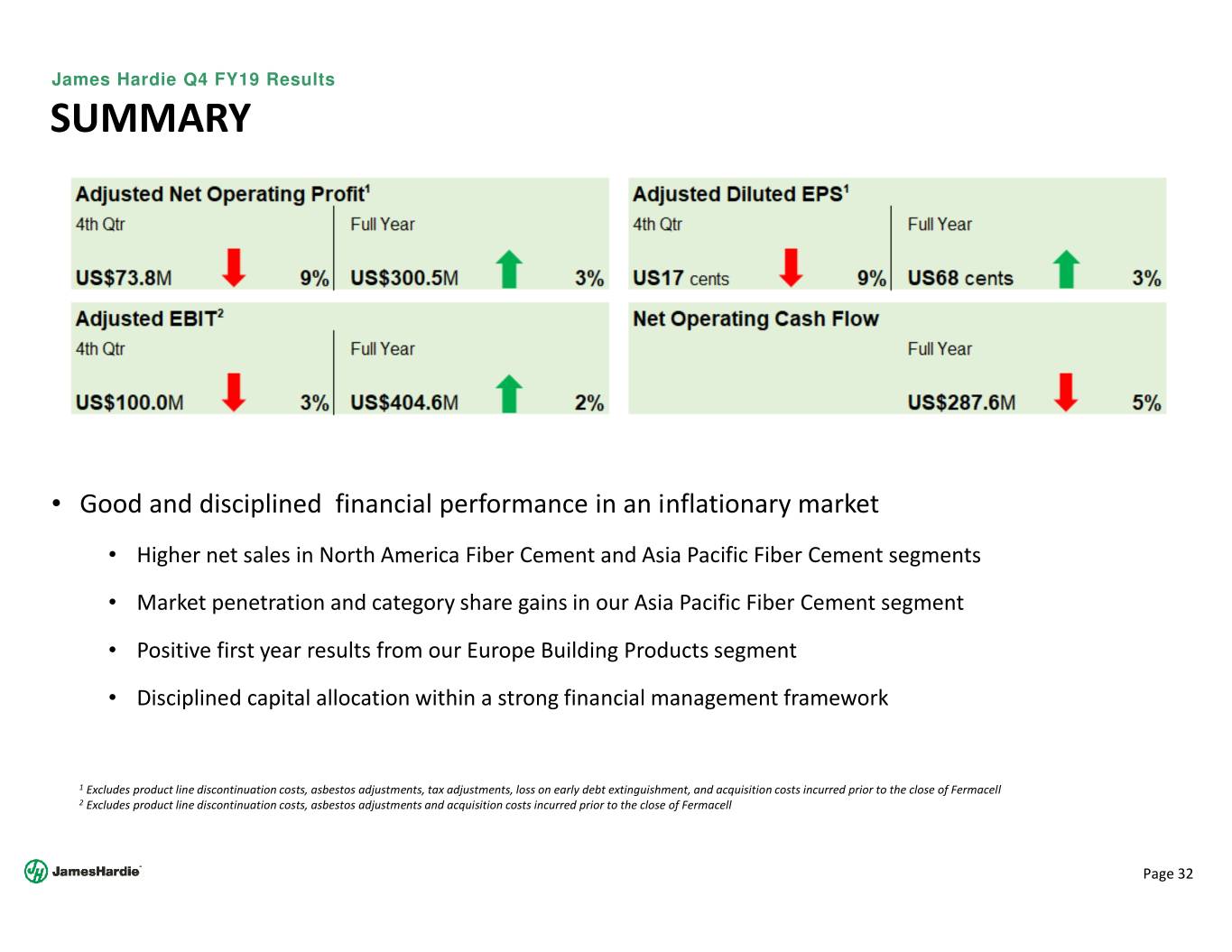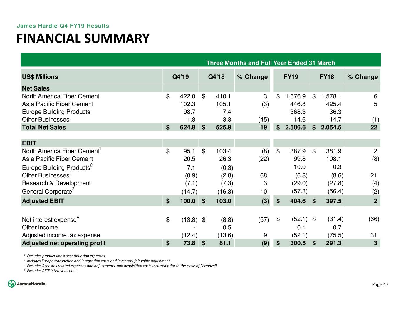 James Hardie Q4 FY19 Results FINANCIAL SUMMARY Three Months and Full Year Ended 31 March US$ Millions Q4’19 Q4’18 % Change FY19 FY18 % Change Net Sales North America Fiber Cement$ 422.0 $ 410.1 3$ 1,676.9 $ 1,578.1 6 Asia Pacific Fiber Cement 102.3 105.1 (3) 446.8 425.4 5 Europe Building Products 98.7 7.4 368.3 36.3 Other Businesses 1.8 3.3 (45) 14.6 14.7 (1) Total Net Sales $ 624.8 $ 525.9 19$ 2,506.6 $ 2,054.5 22 EBIT North America Fiber Cement 1 $ 95.1 $ 103.4 (8) $ 387.9 $ 381.9 2 Asia Pacific Fiber Cement 20.5 26.3 (22) 99.8 108.1 (8) Europe Building Products 2 7.1 (0.3) 10.0 0.3 Other Businesses 1 (0.9) (2.8) 68 (6.8) (8.6) 21 Research & Development (7.1) (7.3) 3 (29.0) (27.8) (4) General Corporate 3 (14.7) (16.3) 10 (57.3) (56.4) (2) Adjusted EBIT $ 100.0 $ 103.0 (3)$ 404.6 $ 397.5 2 Net interest expense 4 $ (13.8) $ (8.8) (57) $ (52.1) $ (31.4) (66) Other income - 0.5 0.1 0.7 Adjusted income tax expense (12.4) (13.6) 9 (52.1) (75.5) 31 Adjusted net operating profit$ 73.8 $ 81.1 (9) $ 300.5 $ 291.3 3 1 Excludes product line discontinuation expenses 2 Includes Europe transaction and integration costs and inventory fair value adjustment 3 Excludes Asbestos related expenses and adjustments, and acquisition costs incurred prior to the close of Fermacell 4 Excludes AICF interest income Page 47