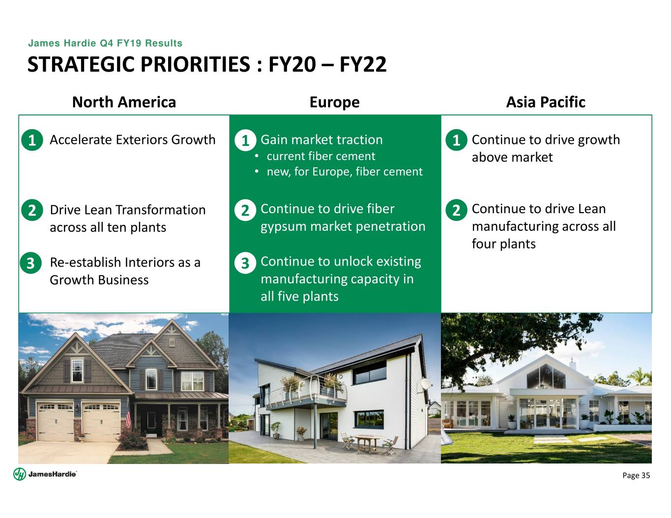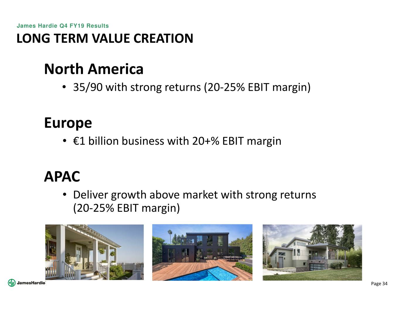 James Hardie Q4 FY19 Results LONG TERM VALUE CREATION North America • 35/90 with strong returns (20-25% EBIT margin) Europe • €1 billion business with 20+% EBIT margin APAC • Deliver growth above market with strong returns (20-25% EBIT margin) Page 34