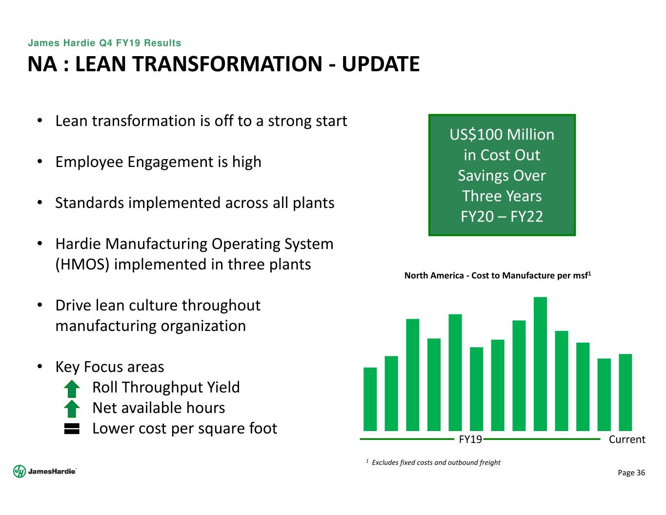 James Hardie Q4 FY19 Results NA : LEAN TRANSFORMATION - UPDATE • Lean transformation is off to a strong start US$100 Million • Employee Engagement is high in Cost Out Savings Over • Standards implemented across all plants Three Years FY20 – FY22 • Hardie Manufacturing Operating System (HMOS) implemented in three plants North America - Cost to Manufacture per msf 1 • Drive lean culture throughout manufacturing organization • Key Focus areas Roll Throughput Yield Net available hours Lower cost per square foot FY19 Current 1 Excludes fixed costs and outbound freight Page 36