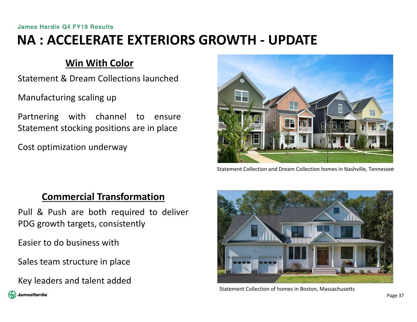 James Hardie Q4 FY19 Results NA : ACCELERATE EXTERIORS GROWTH - UPDATE Win With Color Statement & Dream Collections launched Manufacturing scaling up Partnering with channel to ensure Statement stocking positions are in place Cost optimization underway Statement Collection and Dream Collection homes in Nashville, Tennesse e Commercial Transformation Pull & Push are both required to deliver PDG growth targets, consistently Easier to do business with Sales team structure in place Key leaders and talent added Statement Collection of homes in Boston, Massachusetts Page 37