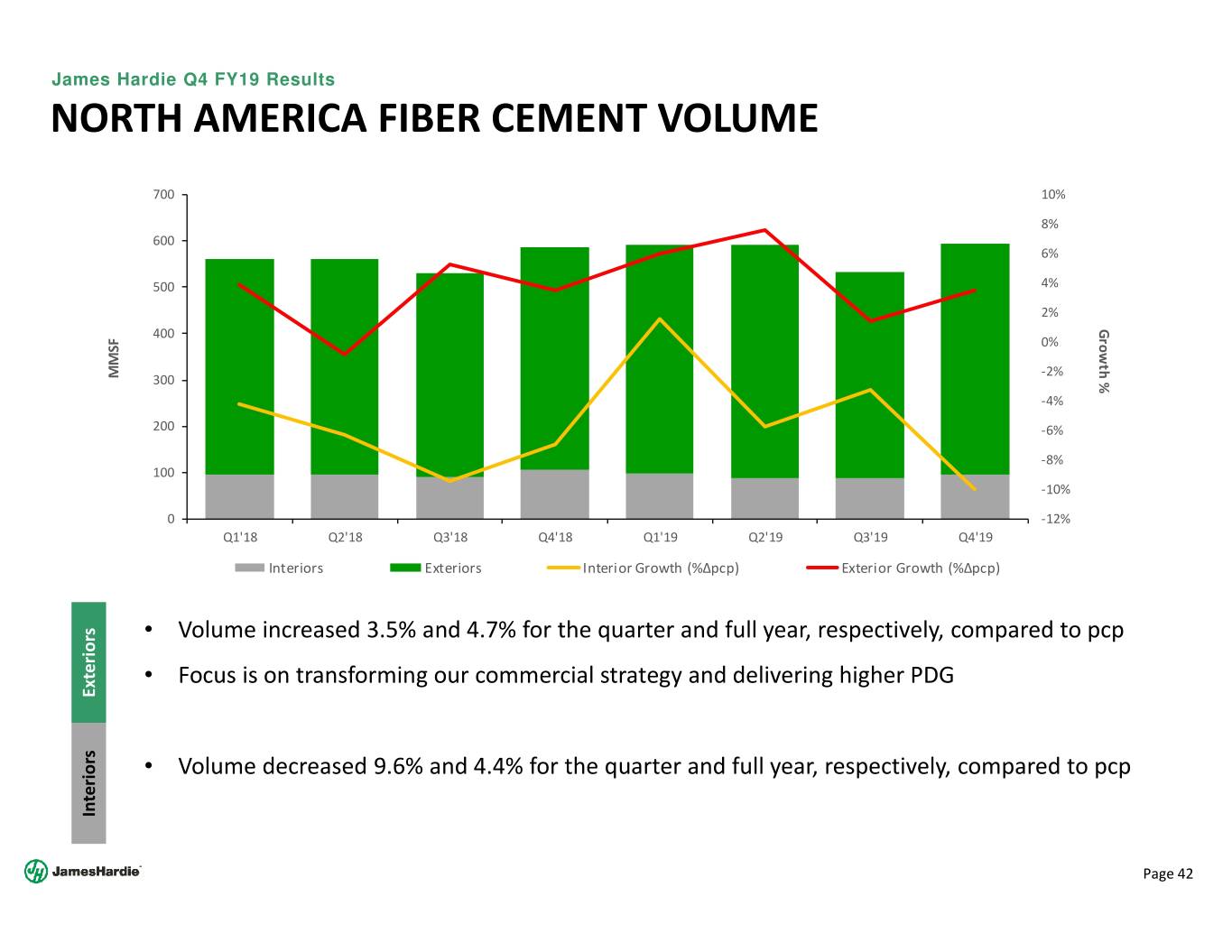 James Hardie Q4 FY19 Results NORTH AMERICA FIBER CEMENT VOLUME 700 10% 8% 600 6% 500 4% 2% 400 % Growth 0% -2% MMSF 300 -4% 200 -6% -8% 100 -10% 0 -12% Q1'18 Q2'18 Q3'18 Q4'18 Q1'19 Q2'19 Q3'19 Q4'19 Interiors Exteriors Interior Growth (%Δpcp) Exterior Growth (%Δpcp) • Volume increased 3.5% and 4.7% for the quarter and full year, respectively, compared to pcp • Focus is on transforming our commercial strategy and delivering higher PDG Exteriors • Volume decreased 9.6% and 4.4% for the quarter and full year, respectively, compared to pcp Interiors Page 42