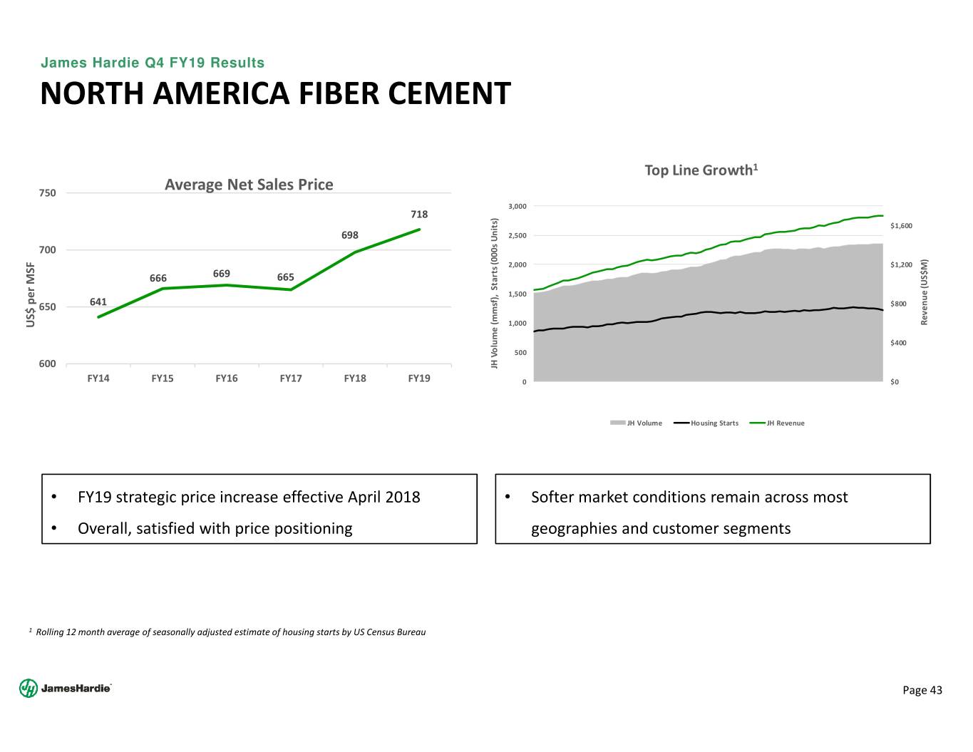 James Hardie Q4 FY19 Results NORTH AMERICA FIBER CEMENT Top Line Growth 1 750 Average Net Sales Price 3,000 718 $1,600 698 2,500 700 2,000 $1,200 666 669 665 1,500 650 641 $800 1,000 Revenue(US$M) US$ per MSF per US$ $400 500 600 Starts Units) (000s (mmsf), Volume JH FY14 FY15 FY16 FY17 FY18 FY19 0 $0 JH Volume Housing Starts JH Revenue • FY19 strategic price increase effective April 2018 • Softer market conditions remain across most • Overall, satisfied with price positioning geographies and customer segments 1 Rolling 12 month average of seasonally adjusted estimate of housing starts by US Census Bureau Page 43