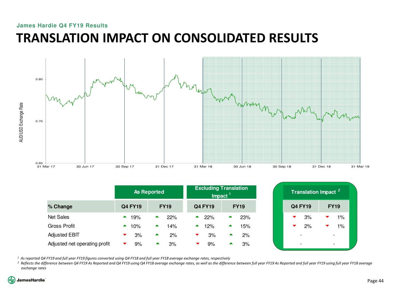 James Hardie Q4 FY19 Results TRANSLATION IMPACT ON CONSOLIDATED RESULTS 0.80 0.70 AUD/USD Rate Exchange 0.60 31 Mar 17 30 Jun 17 30 Sep 17 31 Dec 17 31 Mar 18 30 Jun 18 30 Sep 18 31 Dec 18 31 Mar 19 Excluding Translation 2 As Reported Translation Impact Impact 1 % Change Q4 FY19 FY19 Q4 FY19 FY19 Q4 FY19 FY19 Net Sales ttt 19% ttt 22% ttt 22% ttt 23% uuu 3% uuu 1% Gross Profit ttt 10% ttt 14% ttt 12% ttt 15% uuu 2% uuu 1% Adjusted EBIT uuu 3% ttt 2% uuu 3% ttt 2% - - Adjusted net operating profit uuu 9% ttt 3% uuu 9% ttt 3% - - 1 As reported Q4 FY19 and full year FY19 figures converted using Q4 FY18 and full year FY18 average exchange rates, respectively 2 Reflects the difference between Q4 FY19 As Reported and Q4 FY19 using Q4 FY18 average exchange rates, as well as the difference between full year FY19 As Reported and full year FY19 using full year FY18 average exchange rates Page 44