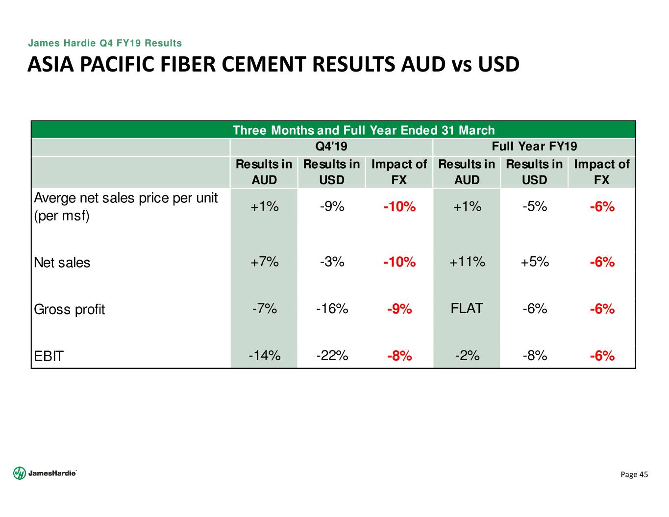 James Hardie Q4 FY19 Results ASIA PACIFIC FIBER CEMENT RESULTS AUD vs USD Three Months and Full Year Ended 31 March Q4'19 Full Year FY19 Results in Results in Impact of Results in Results in Impact of AUD USD FX AUD USD FX Averge net sales price per unit +1% -9% -10% +1% -5% -6% (per msf) Net sales +7% -3% -10% +11% +5% -6% Gross profit -7% -16% -9% FLAT -6% -6% EBIT -14% -22% -8% -2% -8% -6% Page 45