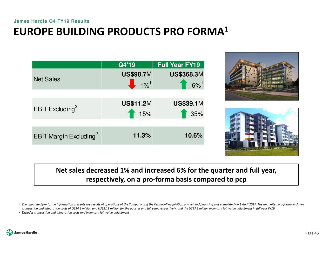 James Hardie Q4 FY19 Results EUROPE BUILDING PRODUCTS PRO FORMA 1 Q4'19 Full Year FY19 US$98.7 M US$368.3 M Net Sales 1% 1 6% 1 US$11.2 M US$39.1 M EBIT Excluding 2 15% 35% EBIT Margin Excluding 2 11.3% 10.6% Net sales decreased 1% and increased 6% for the quarter and full year, respectively, on a pro-forma basis compared to pcp 1 The unaudited pro forma information presents the results of operations of the Company as if the Fermacell acquisition and related financing was completed on 1 April 2017. The unaudited pro forma excludes transaction and integration costs of US$4.1 million and US$21.8 million for the quarter and full year, respectively, and the US$7.3 million inventory fair value adjustment in full year FY19 2 Excludes transaction and integration costs and inventory fair value adjustment Page 46