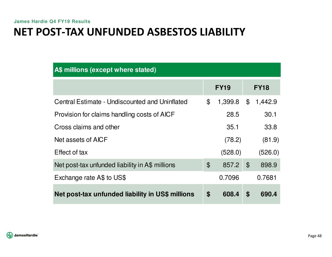 James Hardie Q4 FY19 Results NET POST-TAX UNFUNDED ASBESTOS LIABILITY A$ millions (except where stated) FY19 FY18 Central Estimate - Undiscounted and Uninflated$ 1,399.8 $ 1,442.9 Provision for claims handling costs of AICF 28.5 30.1 Cross claims and other 35.1 33.8 Net assets of AICF (78.2) (81.9) Effect of tax (528.0) (526.0) Net post-tax unfunded liability in A$ millions$ 857.2 $ 898.9 Exchange rate A$ to US$ 0.7096 0.7681 Net post-tax unfunded liability in US$ millions$ 608.4 $ 690.4 Page 48