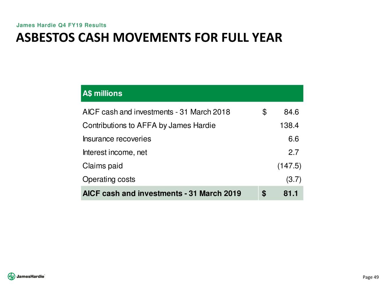 James Hardie Q4 FY19 Results ASBESTOS CASH MOVEMENTS FOR FULL YEAR A$ millions AICF cash and investments - 31 March 2018$ 84.6 Contributions to AFFA by James Hardie 138.4 Insurance recoveries 6.6 Interest income, net 2.7 Claims paid (147.5) Operating costs (3.7) AICF cash and investments - 31 March 2019 $ 81.1 Page 49