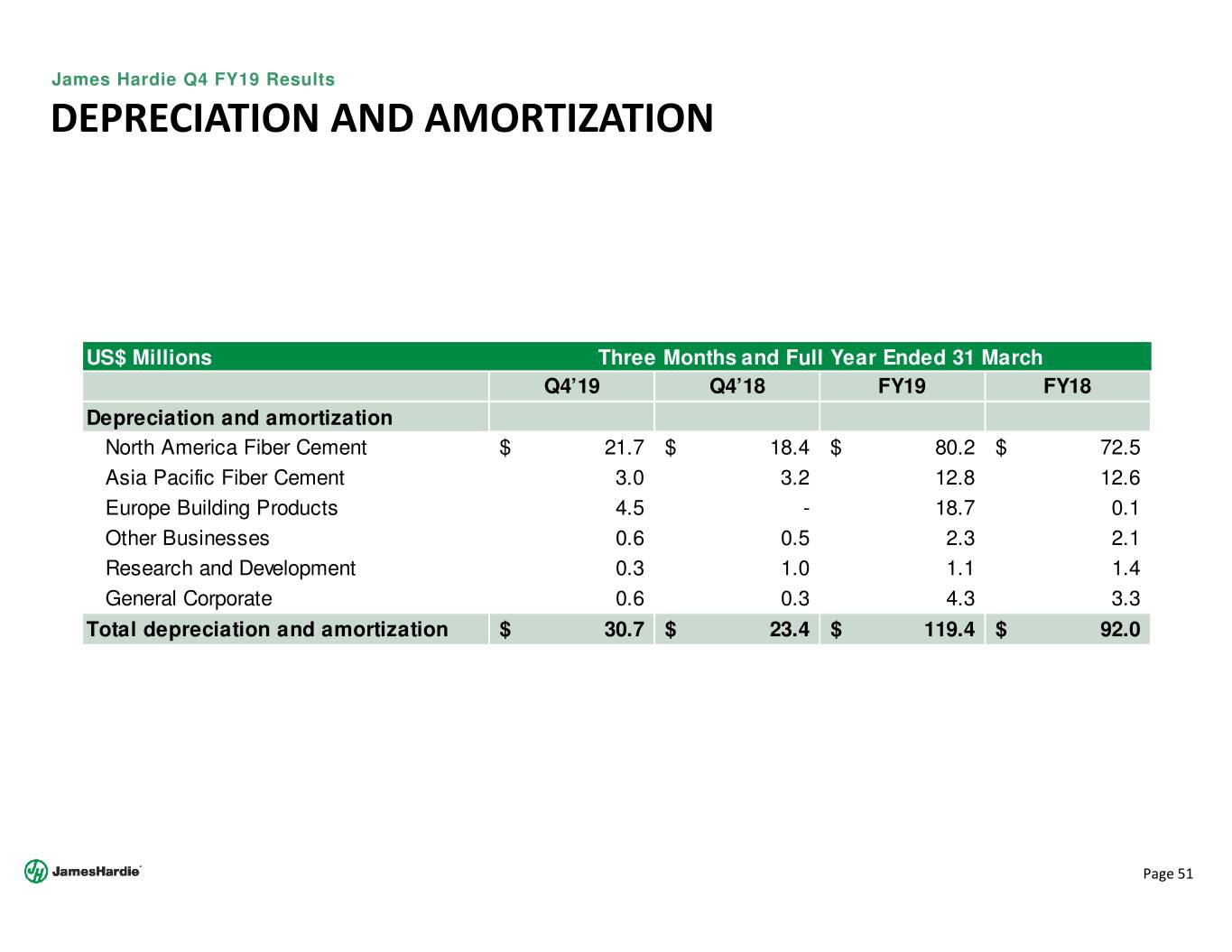 James Hardie Q4 FY19 Results DEPRECIATION AND AMORTIZATION US$ Millions Three Months and Full Year Ended 31 March Q4’19 Q4’18 FY19 FY18 Depreciation and amortization North America Fiber Cement$ 21.7 $ 18.4 $ 80.2 $ 72.5 Asia Pacific Fiber Cement 3.0 3.2 12.8 12.6 Europe Building Products 4.5 - 18.7 0.1 Other Businesses 0.6 0.5 2.3 2.1 Research and Development 0.3 1.0 1.1 1.4 General Corporate 0.6 0.3 4.3 3.3 Total depreciation and amortization$ 30.7 $ 23.4 $ 119.4 $ 92.0 Page 51
