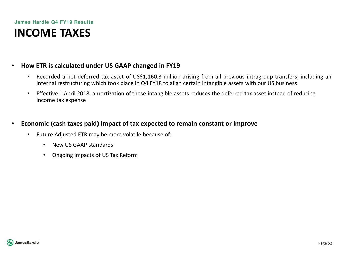 James Hardie Q4 FY19 Results INCOME TAXES • How ETR is calculated under US GAAP changed in FY19 • Recorded a net deferred tax asset of US$1,160.3 million arising from all previous intragroup transfers, including an internal restructuring which took place in Q4 FY18 to align certain intangible assets with our US business • Effective 1 April 2018, amortization of these intangible assets reduces the deferred tax asset instead of reducing income tax expense • Economic (cash taxes paid) impact of tax expected to remain constant or improve • Future Adjusted ETR may be more volatile because of: • New US GAAP standards • Ongoing impacts of US Tax Reform Page 52