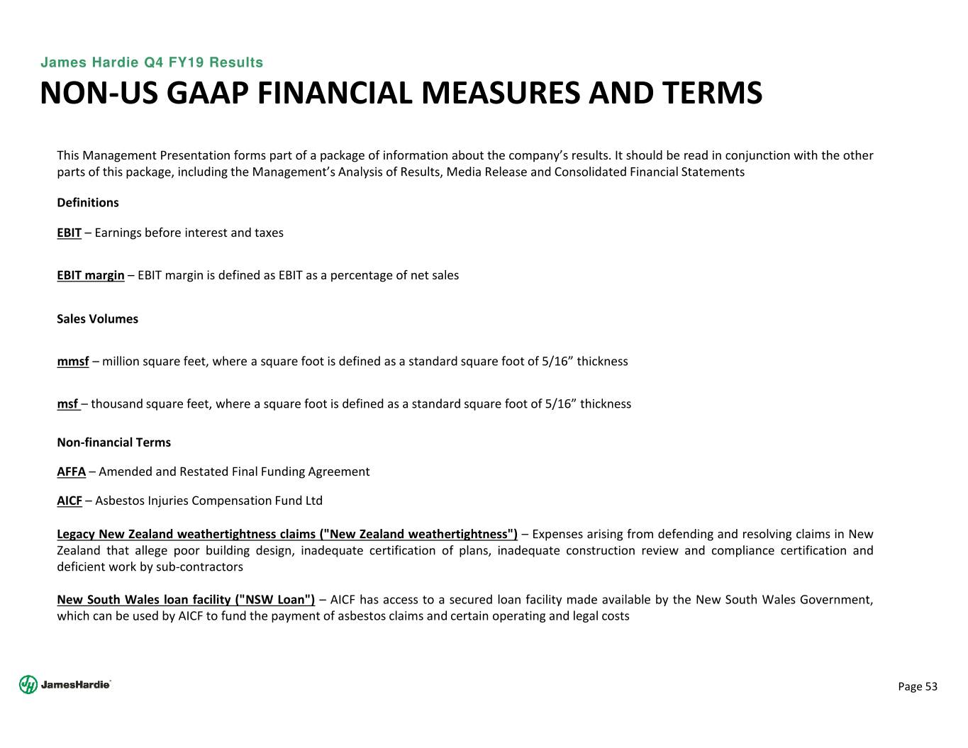 James Hardie Q4 FY19 Results NON-US GAAP FINANCIAL MEASURES AND TERMS This Management Presentation forms part of a package of information about the company’s results. It should be read in conjunction with the other parts of this package, including the Management’s Analysis of Results, Media Release and Consolidated Financial Statements Definitions EBIT – Earnings before interest and taxes EBIT margin – EBIT margin is defined as EBIT as a percentage of net sales Sales Volumes mmsf – million square feet, where a square foot is defined as a standard square foot of 5/16” thickness msf – thousand square feet, where a square foot is defined as a standard square foot of 5/16” thickness Non-financial Terms AFFA – Amended and Restated Final Funding Agreement AICF – Asbestos Injuries Compensation Fund Ltd Legacy New Zealand weathertightness claims ("New Zealand weathertightness") – Expenses arising from defending and resolving claims in New Zealand that allege poor building design, inadequate certification of plans, inadequate construction review and compliance certification and deficient work by sub-contractors New South Wales loan facility ("NSW Loan") – AICF has access to a secured loan facility made available by the New South Wales Government, which can be used by AICF to fund the payment of asbestos claims and certain operating and legal costs Page 53