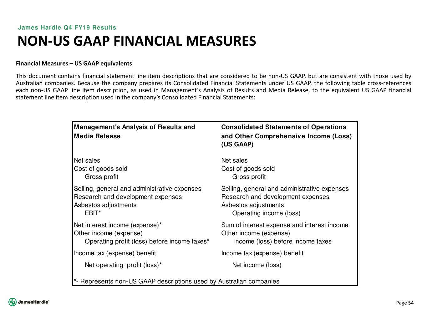 James Hardie Q4 FY19 Results NON-US GAAP FINANCIAL MEASURES Financial Measures – US GAAP equivalents This document contains financial statement line item descriptions that are considered to be non-US GAAP, but are consistent with those used by Australian companies. Because the company prepares its Consolidated Financial Statements under US GAAP, the following table cross-references each non-US GAAP line item description, as used in Management’s Analysis of Results and Media Release, to the equivalent US GAAP financial statement line item description used in the company’s Consolidated Financial Statements: Management's Analysis of Results and Consolidated Statements of Operations Media Release and Other Comprehensive Income (Loss) (US GAAP) Net sales Net sales Cost of goods sold Cost of goods sold Gross profit Gross profit Selling, general and administrative expenses Selling, general and administrative expenses Research and development expenses Research and development expenses Asbestos adjustments Asbestos adjustments EBIT* Operating income (loss) Net interest income (expense)* Sum of interest expense and interest income Other income (expense) Other income (expense) Operating profit (loss) before income taxes* Income (loss) before income taxes Income tax (expense) benefit Income tax (expense) benefit Net operating profit (loss)* Net income (loss) *- Represents non-US GAAP descriptions used by Australian companies. Page 54