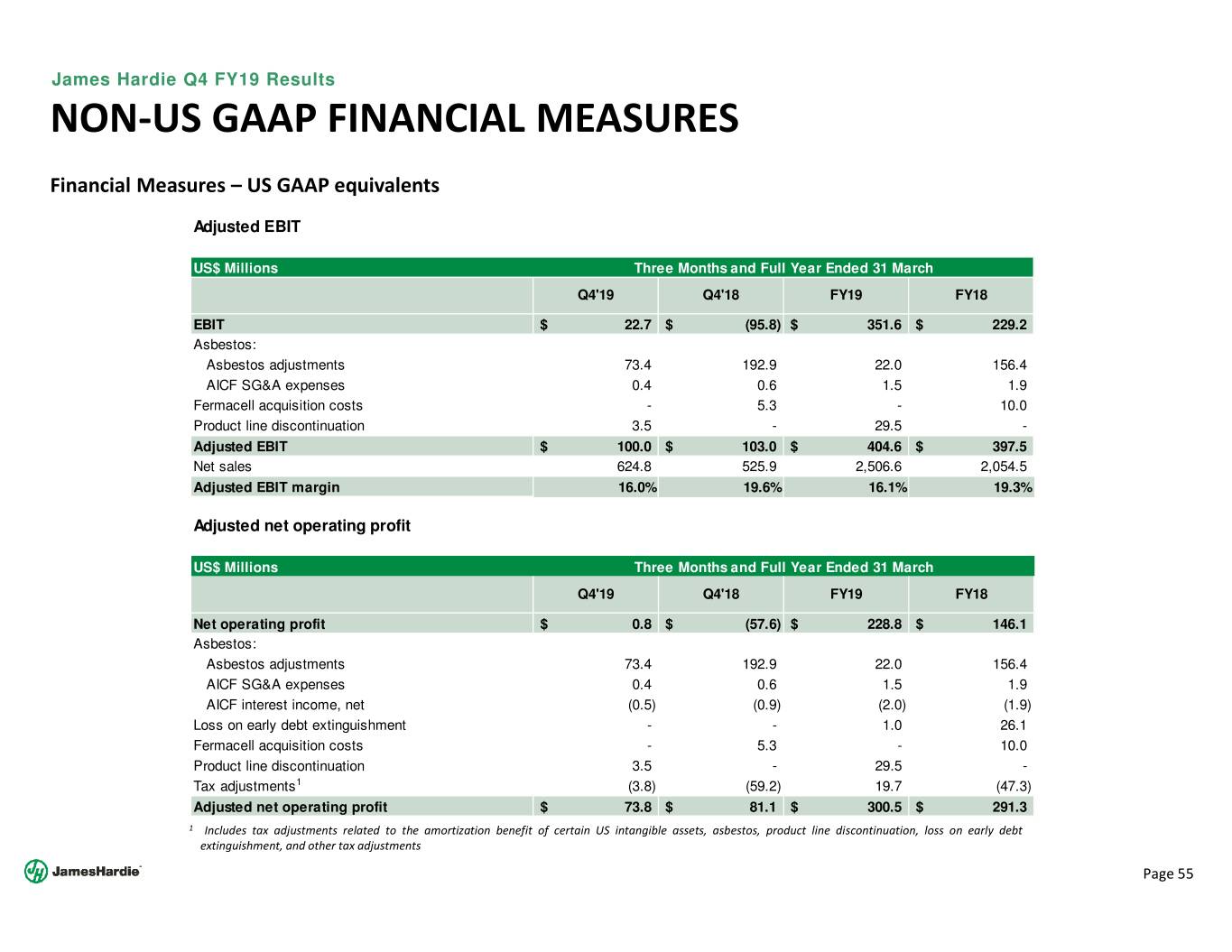 James Hardie Q4 FY19 Results NON-US GAAP FINANCIAL MEASURES Financial Measures – US GAAP equivalents Adjusted EBIT US$ Millions Three Months and Full Year Ended 31 March Q4'19 Q4'18 FY19 FY18 EBIT $ 22.7 $ (95.8) $ 351.6 $ 229.2 Asbestos: Asbestos adjustments 73.4 192.9 22.0 156.4 AICF SG&A expenses 0.4 0.6 1.5 1.9 Fermacell acquisition costs - 5.3 - 10.0 Product line discontinuation 3.5 - 29.5 - Adjusted EBIT $ 100.0 $ 103.0 $ 404.6 $ 397.5 Net sales 624.8 525.9 2,506.6 2,054.5 Adjusted EBIT margin 16.0% 19.6% 16.1% 19.3% Adjusted net operating profit US$ Millions Three Months and Full Year Ended 31 March Q4'19 Q4'18 FY19 FY18 Net operating profit $ 0.8 $ (57.6) $ 228.8 $ 146.1 Asbestos: Asbestos adjustments 73.4 192.9 22.0 156.4 AICF SG&A expenses 0.4 0.6 1.5 1.9 AICF interest income, net (0.5) (0.9) (2.0) (1.9) Loss on early debt extinguishment - - 1.0 26.1 Fermacell acquisition costs - 5.3 - 10.0 Product line discontinuation 3.5 - 29.5 - Tax adjustments 1 (3.8) (59.2) 19.7 (47.3) Adjusted net operating profit $ 73.8 $ 81.1 $ 300.5 $ 291.3 1 Includes tax adjustments related to the amortization benefit of certain US intangible assets, asbestos, product line discontinuation, loss on early debt extinguishment, and other tax adjustments Page 55