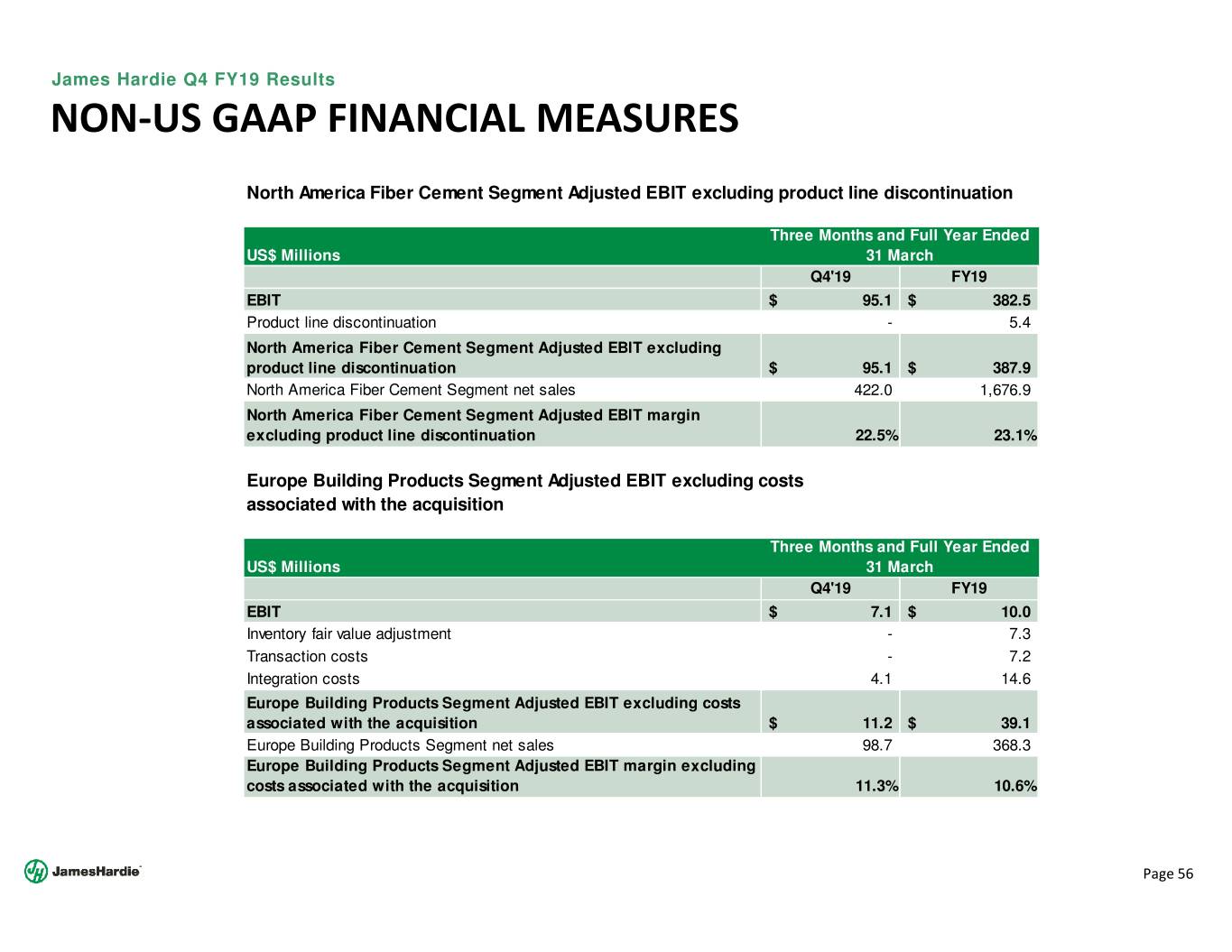 James Hardie Q4 FY19 Results NON-US GAAP FINANCIAL MEASURES North America Fiber Cement Segment Adjusted EBIT excluding product line discontinuation Three Months and Full Year Ended US$ Millions 31 March Q4'19 FY19 EBIT $ 95.1 $ 382.5 Product line discontinuation - 5.4 North America Fiber Cement Segment Adjusted EBIT excluding product line discontinuation $ 95.1 $ 387.9 North America Fiber Cement Segment net sales 422.0 1,676.9 North America Fiber Cement Segment Adjusted EBIT margin excluding product line discontinuation 22.5% 23.1% Europe Building Products Segment Adjusted EBIT excluding costs associated with the acquisition Three Months and Full Year Ended US$ Millions 31 March Q4'19 FY19 EBIT $ 7.1 $ 10.0 Inventory fair value adjustment - 7.3 Transaction costs - 7.2 Integration costs 4.1 14.6 Europe Building Products Segment Adjusted EBIT excluding costs associated with the acquisition $ 11.2 $ 39.1 Europe Building Products Segment net sales 98.7 368.3 Europe Building Products Segment Adjusted EBIT margin excluding costs associated with the acquisition 11.3% 10.6% Page 56