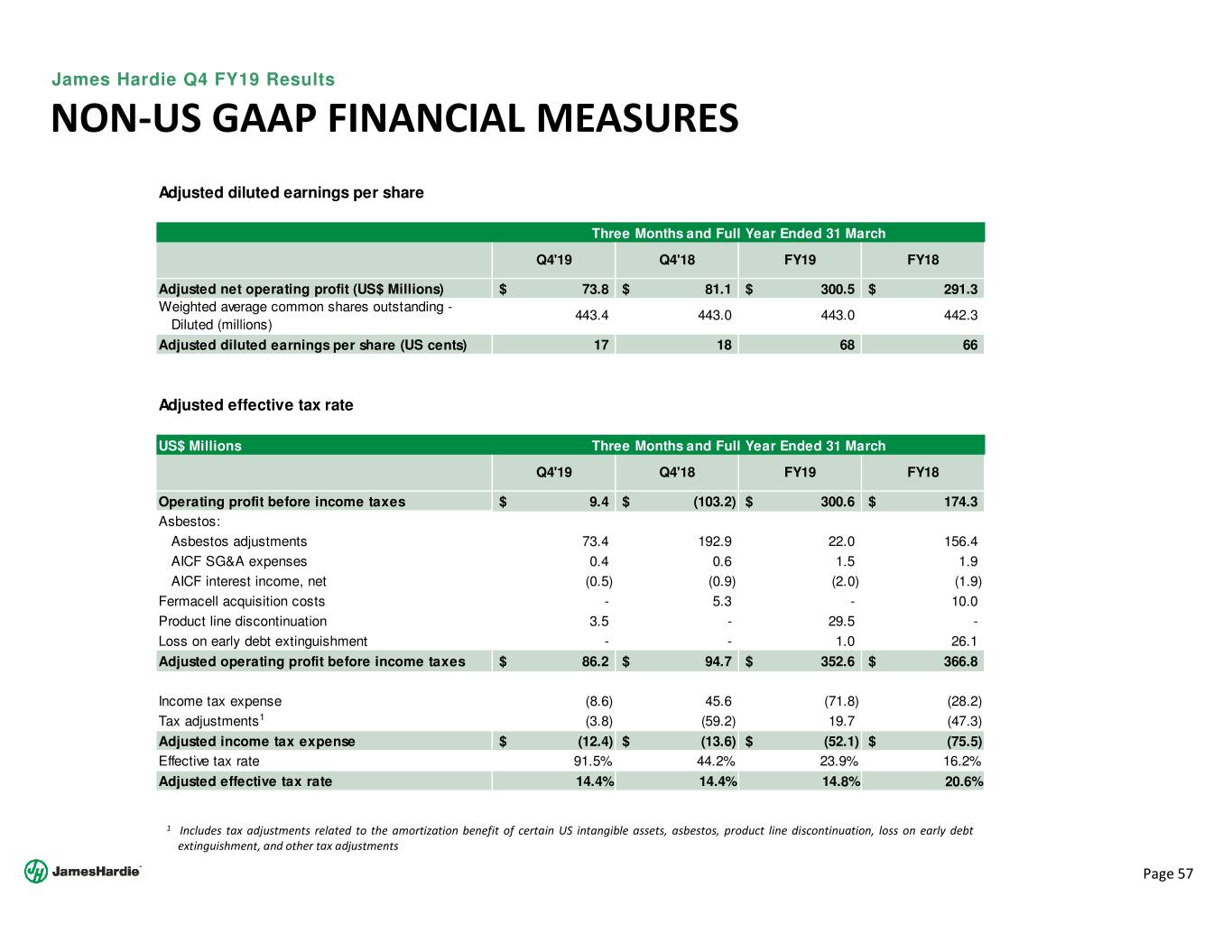 James Hardie Q4 FY19 Results NON-US GAAP FINANCIAL MEASURES Adjusted diluted earnings per share Three Months and Full Year Ended 31 March Q4'19 Q4'18 FY19 FY18 Adjusted net operating profit (US$ Millions) $ 73.8 $ 81.1 $ 300.5 $ 291.3 Weighted average common shares outstanding - 443.4 443.0 443.0 442.3 Diluted (millions) Adjusted diluted earnings per share (US cents) 17 18 68 66 Adjusted effective tax rate US$ Millions Three Months and Full Year Ended 31 March Q4'19 Q4'18 FY19 FY18 Operating profit before income taxes$ 9.4 $ (103.2) $ 300.6 $ 174.3 Asbestos: Asbestos adjustments 73.4 192.9 22.0 156.4 AICF SG&A expenses 0.4 0.6 1.5 1.9 AICF interest income, net (0.5) (0.9) (2.0) (1.9) Fermacell acquisition costs - 5.3 - 10.0 Product line discontinuation 3.5 - 29.5 - Loss on early debt extinguishment - - 1.0 26.1 Adjusted operating profit before income taxes $ 86.2 $ 94.7 $ 352.6 $ 366.8 Income tax expense (8.6) 45.6 (71.8) (28.2) Tax adjustments 1 (3.8) (59.2) 19.7 (47.3) Adjusted income tax expense $ (12.4) $ (13.6) $ (52.1) $ (75.5) Effective tax rate 91.5% 44.2% 23.9% 16.2% Adjusted effective tax rate 14.4% 14.4% 14.8% 20.6% 1 Includes tax adjustments related to the amortization benefit of certain US intangible assets, asbestos, product line discontinuation, loss on early debt extinguishment, and other tax adjustments Page 57