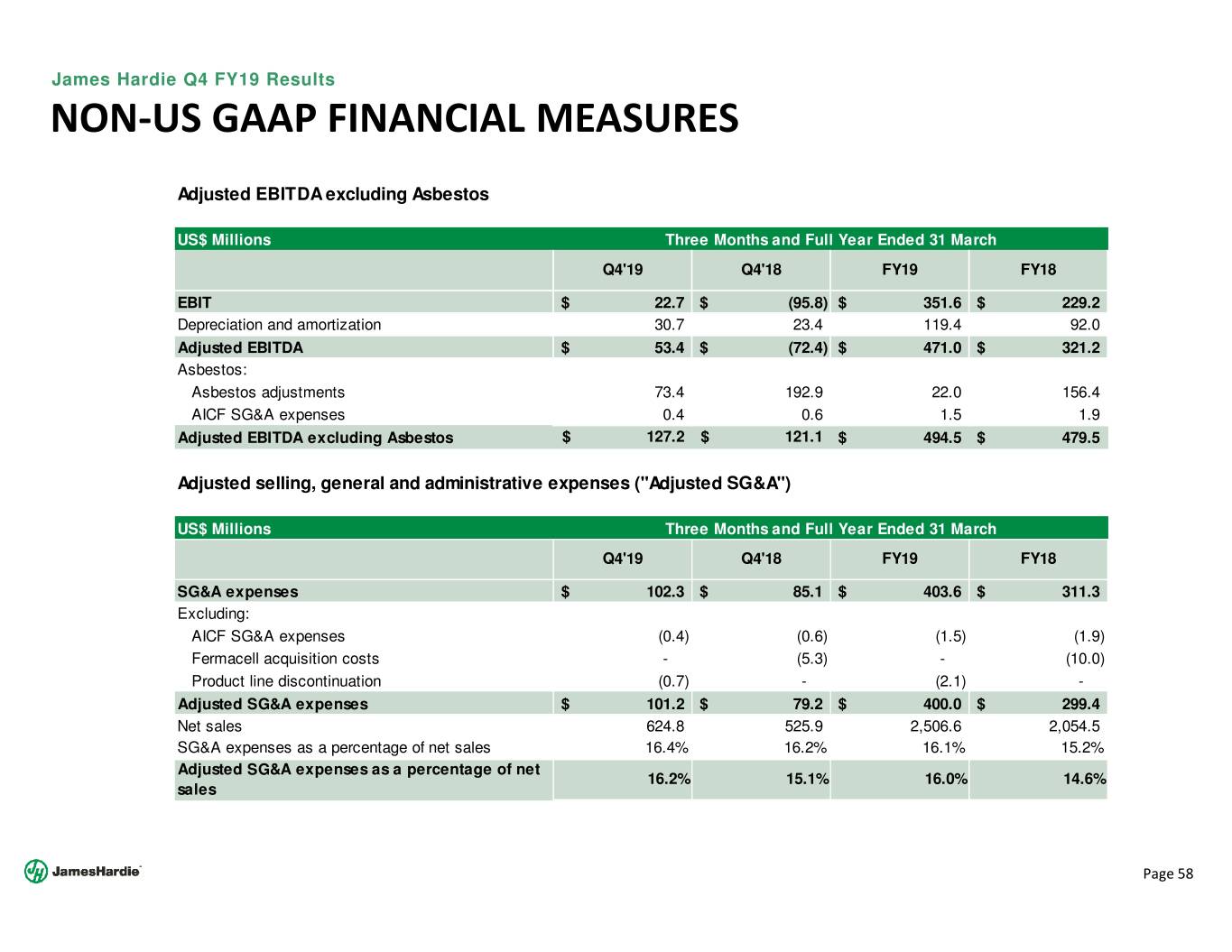 James Hardie Q4 FY19 Results NON-US GAAP FINANCIAL MEASURES Adjusted EBITDA excluding Asbestos US$ Millions Three Months and Full Year Ended 31 March Q4'19 Q4'18 FY19 FY18 EBIT $ 22.7 $ (95.8) $ 351.6 $ 229.2 Depreciation and amortization 30.7 23.4 119.4 92.0 Adjusted EBITDA $ 53.4 $ (72.4) $ 471.0 $ 321.2 Asbestos: Asbestos adjustments 73.4 192.9 22.0 156.4 AICF SG&A expenses 0.4 0.6 1.5 1.9 Adjusted EBITDA excluding Asbestos $ 127.2 $ 121.1 $ 494.5 $ 479.5 Adjusted selling, general and administrative expenses ("Adjusted SG&A") US$ Millions Three Months and Full Year Ended 31 March Q4'19 Q4'18 FY19 FY18 SG&A expenses $ 102.3 $ 85.1 $ 403.6 $ 311.3 Excluding: AICF SG&A expenses (0.4) (0.6) (1.5) (1.9) Fermacell acquisition costs - (5.3) - (10.0) Product line discontinuation (0.7) - (2.1) - Adjusted SG&A expenses $ 101.2 $ 79.2 $ 400.0 $ 299.4 Net sales 624.8 525.9 2,506.6 2,054.5 SG&A expenses as a percentage of net sales 16.4% 16.2% 16.1% 15.2% Adjusted SG&A expenses as a percentage of net 16.2% 15.1% 16.0% 14.6% sales Page 58