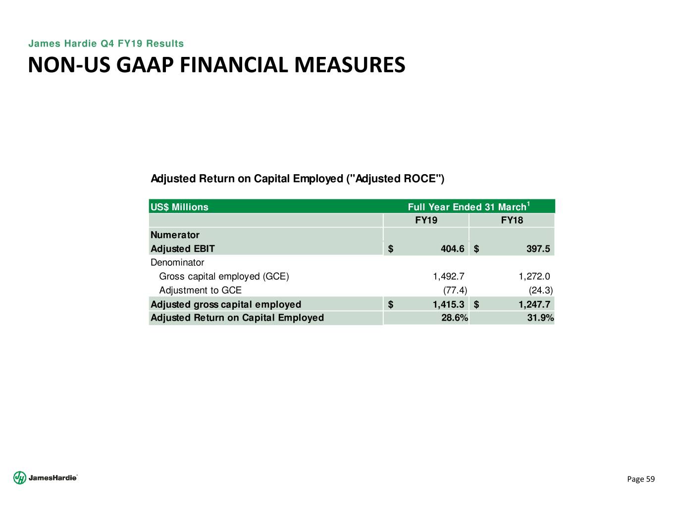 James Hardie Q4 FY19 Results NON-US GAAP FINANCIAL MEASURES Adjusted Return on Capital Employed ("Adjusted ROCE") US$ Millions Full Year Ended 31 March 1 FY19 FY18 Numerator Adjusted EBIT $ 404.6 $ 397.5 Denominator Gross capital employed (GCE) 1,492.7 1,272.0 Adjustment to GCE (77.4) (24.3) Adjusted gross capital employed $ 1,415.3 $ 1,247.7 Adjusted Return on Capital Employed 28.6% 31.9% Page 59