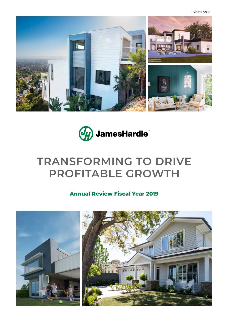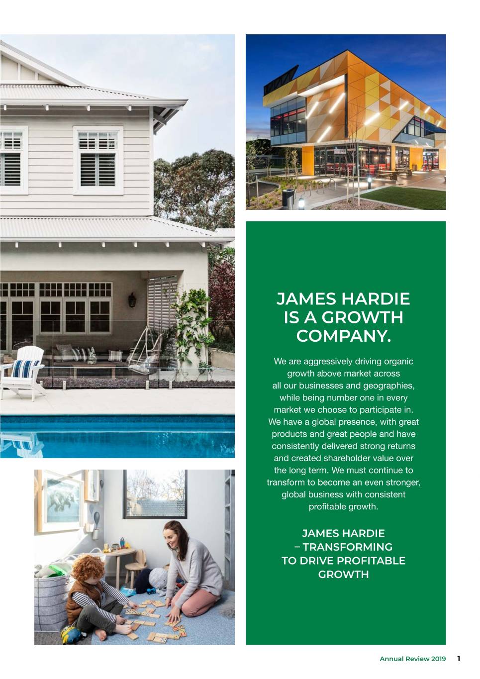 JAMES HARDIE IS A GROWTH COMPANY. We are aggressively driving organic growth above market across all our businesses and geographies, while being number one in every market we choose to participate in. We have a global presence, with great products and great people and have consistently delivered strong returns and created shareholder value over the long term. We must continue to transform to become an even stronger, global business with consistent profitable growth. JAMES HARDIE – TRANSFORMING TO DRIVE PROFITABLE GROWTH Annual Review 2019 1