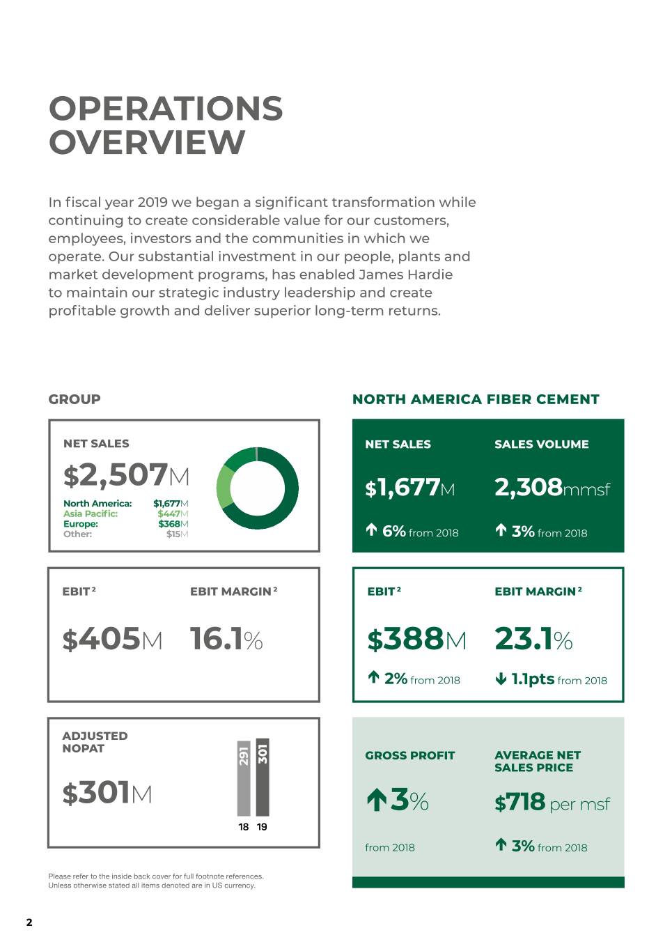 OPERATIONS OVERVIEW In fiscal year 2019 we began a significant transformation while continuing to create considerable value for our customers, employees, investors and the communities in which we operate. Our substantial investment in our people, plants and market development programs, has enabled James Hardie to maintain our strategic industry leadership and create profitable growth and deliver superior long-term returns. GROUP NORTH AMERICA FIBER CEMENT NET SALES NET SALES SALES VOLUME $ M 2,507 $1,677M 2,308mmsf North America: $1,677M Asia Pacific: $447M Europe: $368M Other: $15M 6% from 2018 3% from 2018 EBIT 2 EBIT MARGIN 2 EBIT 2 EBIT MARGIN 2 $405M 16.1% $388M 23.1% 2% from 2018 1.1pts from 2018 ADJUSTED NOPAT GROSS PROFIT AVERAGE NET 301 291 SALES PRICE $301M 3% $718 per msf 18 19 from 2018 3% from 2018 Please refer to the inside back cover for full footnote references. Unless otherwise stated all items denoted are in US currency. 2