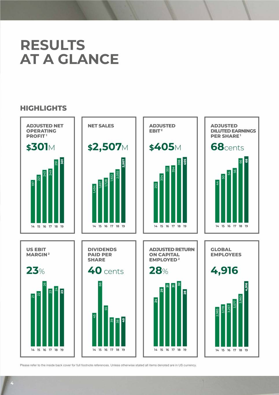 RESULTS AT A GLANCE HIGHLIGHTS ADJUSTED NET NET SALES ADJUSTED ADJUSTED OPERATING EBIT 2 DILUTED EARNINGS PROFIT 1 PER SHARE 1 $301M $2,507M $405M 68cents 68 66 301 405 398 291 2,507 351 354 56 54 249 243 2,055 50 304 221 1,922 44 197 1,728 1,657 253 1,494 14 15 16 17 18 19 14 15 16 17 18 19 14 15 16 17 18 19 14 15 16 17 18 19 US EBIT DIVIDENDS ADJUSTED RETURN GLOBAL MARGIN 2 PAID PER ON CAPITAL EMPLOYEES SHARE EMPLOYED 2 23% 40 cents 28% 4,916 32 26 88 31 31 4,916 24 29 23 23 28 22 21 24 3,960 3,577 55 3,257 3,178 2,983 45 40 39 38 14 15 16 17 18 19 14 15 16 17 18 19 14 15 16 17 18 19 14 15 16 17 18 19 Please refer to the inside back cover for full footnote references. Unless otherwise stated all items denoted are in US currency. 4