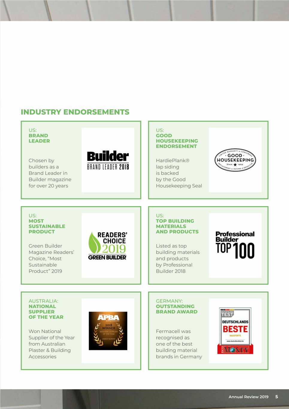 INDUSTRY ENDORSEMENTS US: US: BRAND GOOD LEADER HOUSEKEEPING ENDORSEMENT Chosen by HardiePlank® builders as a lap siding Brand Leader in is backed Builder magazine by the Good for over 20 years Housekeeping Seal US: US: MOST TOP BUILDING SUSTAINABLE MATERIALS PRODUCT AND PRODUCTS Green Builder Listed as top Magazine Readers’ building materials Choice, “Most and products Sustainable by Professional Product” 2019 Builder 2018 AUSTRALIA: GERMANY: NATIONAL OUTSTANDING SUPPLIER BRAND AWARD OF THE YEAR Won National Fermacell was Supplier of the Year recognised as from Australian one of the best Plaster & Building building material Accessories brands in Germany Annual Review 2019 5