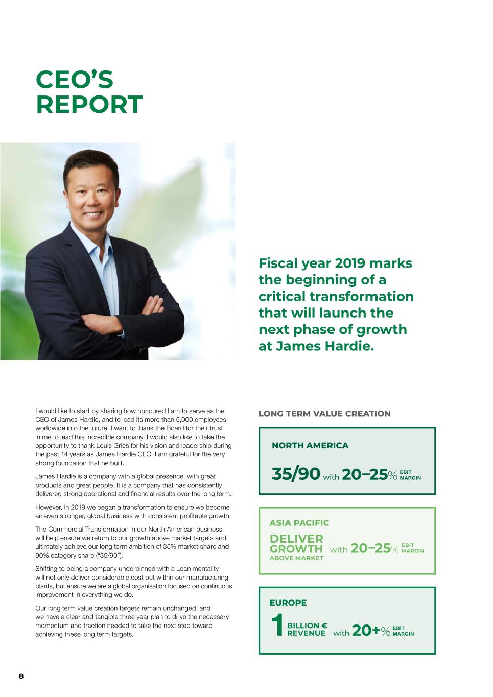 CEO’S REPORT Fiscal year 2019 marks the beginning of a critical transformation that will launch the next phase of growth at James Hardie. I would like to start by sharing how honoured I am to serve as the LONG TERM VALUE CREATION CEO of James Hardie, and to lead its more than 5,000 employees worldwide into the future. I want to thank the Board for their trust in me to lead this incredible company. I would also like to take the opportunity to thank Louis Gries for his vision and leadership during NORTH AMERICA the past 14 years as James Hardie CEO. I am grateful for the very strong foundation that he built. EBIT James Hardie is a company with a global presence, with great 35/90 with 20–25% MARGIN products and great people. It is a company that has consistently delivered strong operational and financial results over the long term. However, in 2019 we began a transformation to ensure we become an even stronger, global business with consistent profitable growth. ASIA PACIFIC The Commercial Transformation in our North American business will help ensure we return to our growth above market targets and DELIVER ultimately achieve our long term ambition of 35% market share and EBIT GROWTH with 20–25% MARGIN 90% category share (“35/90”). ABOVE MARKET Shifting to being a company underpinned with a Lean mentality will not only deliver considerable cost out within our manufacturing plants, but ensure we are a global organisation focused on continuous improvement in everything we do. EUROPE Our long term value creation targets remain unchanged, and we have a clear and tangible three year plan to drive the necessary momentum and traction needed to take the next step toward BILLION € EBIT achieving these long term targets. 1REVENUE with 20+% MARGIN 8