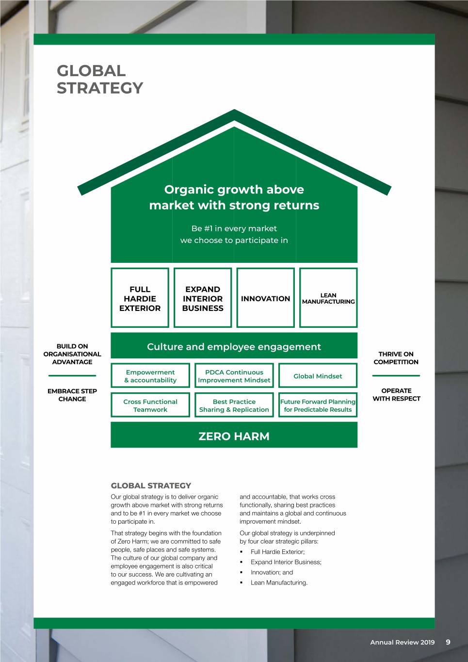 GLOBAL STRATEGY Organic growth above market with strong returns Be #1 in every market we choose to participate in FULL EXPAND LEAN HARDIE INTERIOR INNOVATION MANUFACTURING EXTERIOR BUSINESS BUILD ON Culture and employee engagement ORGANISATIONAL THRIVE ON ADVANTAGE COMPETITION Empowerment PDCA Continuous Global Mindset & accountability Improvement Mindset EMBRACE STEP OPERATE WITH RESPECT CHANGE Cross Functional Best Practice Future Forward Planning Teamwork Sharing & Replication for Predictable Results ZERO HARM GLOBAL STRATEGY Our global strategy is to deliver organic and accountable, that works cross growth above market with strong returns functionally, sharing best practices and to be #1 in every market we choose and maintains a global and continuous to participate in. improvement mindset. That strategy begins with the foundation Our global strategy is underpinned of Zero Harm; we are committed to safe by four clear strategic pillars: people, safe places and safe systems. §§ Full Hardie Exterior; The culture of our global company and §§ Expand Interior Business; employee engagement is also critical to our success. We are cultivating an §§ Innovation; and engaged workforce that is empowered §§ Lean Manufacturing. Annual Review 2019 9