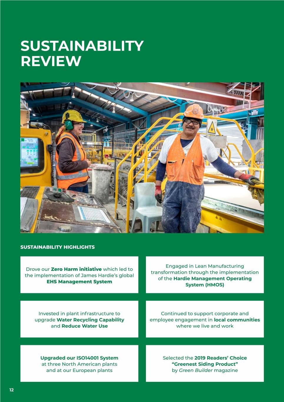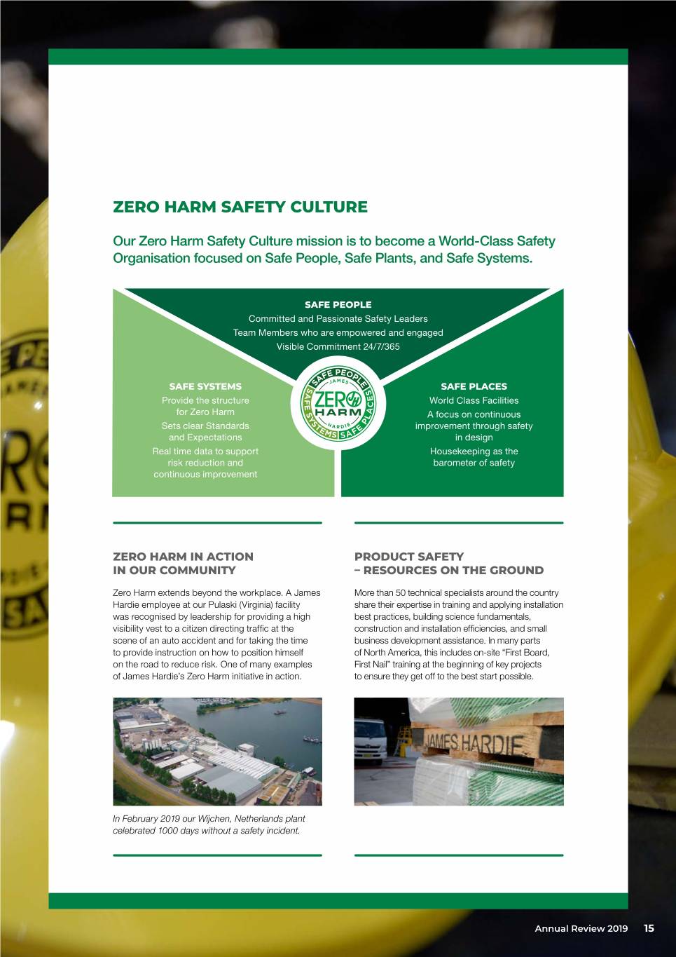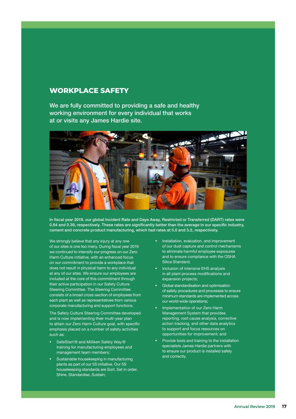 WORKPLACE SAFETY We are fully committed to providing a safe and healthy working environment for every individual that works at or visits any James Hardie site. In fiscal year 2019, our global Incident Rate and Days Away, Restricted or Transferred (DART) rates were 0.84 and 0.39, respectively. These rates are significantly better than the average in our specific industry, cement and concrete product manufacturing, which had rates at 5.0 and 3.2, respectively. We strongly believe that any injury at any one §§ Installation, evaluation, and improvement of our sites is one too many. During fiscal year 2019 of our dust capture and control mechanisms we continued to intensify our progress on our Zero to eliminate harmful employee exposures Harm Culture initiative, with an enhanced focus and to ensure compliance with the OSHA on our commitment to provide a workplace that Silica Standard; does not result in physical harm to any individual §§ Inclusion of intensive EHS analysis at any of our sites. We ensure our employees are in all plant process modifications and included at the core of this commitment through expansion projects; their active participation in our Safety Culture §§ Global standardisation and optimisation Steering Committee. The Steering Committee of safety procedures and processes to ensure consists of a broad cross-section of employees from minimum standards are implemented across each plant as well as representatives from various our world‑wide operations; corporate manufacturing and support functions. §§ Implementation of our Zero Harm The Safety Culture Steering Committee developed Management System that provides and is now implementing their multi-year plan reporting, root cause analysis, corrective to attain our Zero Harm Culture goal, with specific action tracking, and other data analytics emphasis placed on a number of safety activities to support and focus resources on such as: opportunities for improvement; and §§ SafeStart ® and Milliken Safety Way ® §§ Provide tools and training to the installation training for manufacturing employees and specialists James Hardie partners with management team members; to ensure our product is installed safely and correctly. §§ Sustainable housekeeping in manufacturing plants as part of our 5S initiative. Our 5S housekeeping standards are Sort, Set in order, Shine, Standardise, Sustain; Annual Review 2019 17