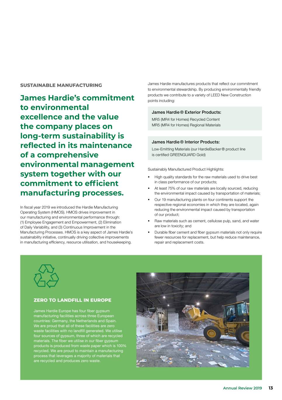SUSTAINABLE MANUFACTURING James Hardie manufactures products that reflect our commitment to environmental stewardship. By producing environmentally friendly products we contribute to a variety of LEED New Construction James Hardie’s commitment points including: to environmental James Hardie ® Exterior Products: excellence and the value MR5 (MR4 for Homes) Recycled Content the company places on MR5 (MR4 for Homes) Regional Materials long‑term sustainability is James Hardie ® Interior Products: reflected in its maintenance Low-Emitting Materials (our HardieBacker ® product line of a comprehensive is certified GREENGUARD Gold) environmental management Sustainably Manufactured Product Highlights: system together with our §§ High quality standards for the raw materials used to drive best commitment to efficient in class performance of our products; §§ At least 75% of our raw materials are locally sourced, reducing manufacturing processes. the environmental impact caused by transportation of materials; §§ Our 19 manufacturing plants on four continents support the respective regional economies in which they are located, again In fiscal year 2019 we introduced the Hardie Manufacturing reducing the environmental impact caused by transportation Operating System (HMOS). HMOS drives improvement in of our product; our manufacturing and environmental performance through: (1) Employee Engagement and Empowerment, (2) Elimination §§ Raw materials such as cement, cellulose pulp, sand, and water of Daily Variability, and (3) Continuous Improvement in the are low in toxicity; and Manufacturing Processes. HMOS is a key aspect of James Hardie’s §§ Durable fiber cement and fiber gypsum materials not only require sustainability initiative, continually driving collective improvements fewer resources for replacement, but help reduce maintenance, in manufacturing efficiency, resource utilisation, and housekeeping. repair and replacement costs. ZERO TO LANDFILL IN EUROPE James Hardie Europe has four fiber gypsum manufacturing facilities across three European countries: Germany, the Netherlands and Spain. We are proud that all of these facilities are zero waste facilities with no landfill generated. We utilise four sources of gypsum, three of which are recycled materials. The fiber we utilise in our fiber gypsum products is produced from waste paper which is 100% recycled. We are proud to maintain a manufacturing process that leverages a majority of materials that are recycled and produces zero waste. Annual Review 2019 13