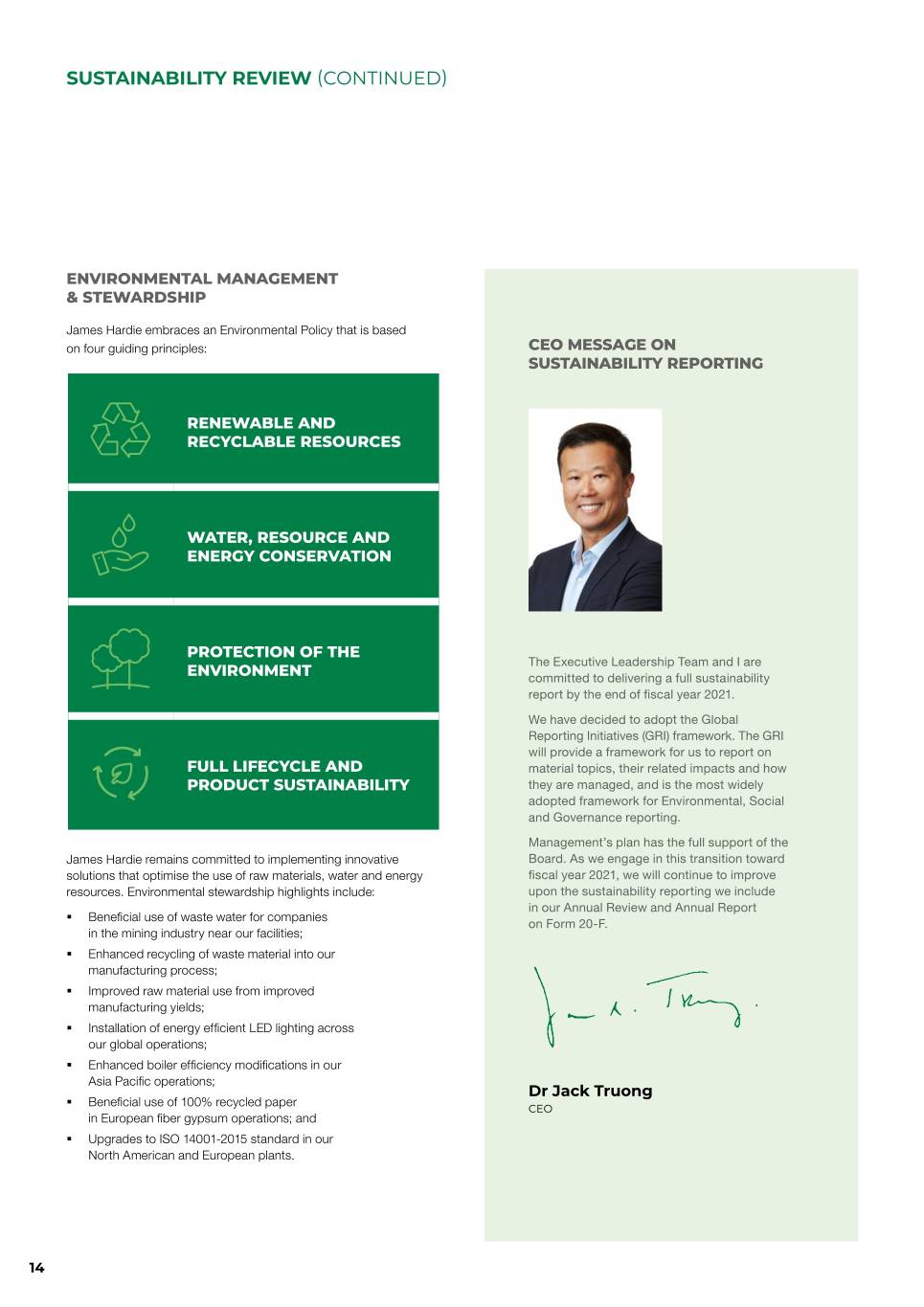 SUSTAINABILITY REVIEW (CONTINUED) ENVIRONMENTAL MANAGEMENT & STEWARDSHIP James Hardie embraces an Environmental Policy that is based on four guiding principles: CEO MESSAGE ON SUSTAINABILITY REPORTING RENEWABLE AND RECYCLABLE RESOURCES WATER, RESOURCE AND ENERGY CONSERVATION PROTECTION OF THE The Executive Leadership Team and I are ENVIRONMENT committed to delivering a full sustainability report by the end of fiscal year 2021. We have decided to adopt the Global Reporting Initiatives (GRI) framework. The GRI will provide a framework for us to report on FULL LIFECYCLE AND material topics, their related impacts and how PRODUCT SUSTAINABILITY they are managed, and is the most widely adopted framework for Environmental, Social and Governance reporting. Management’s plan has the full support of the James Hardie remains committed to implementing innovative Board. As we engage in this transition toward solutions that optimise the use of raw materials, water and energy fiscal year 2021, we will continue to improve resources. Environmental stewardship highlights include: upon the sustainability reporting we include in our Annual Review and Annual Report §§ Beneficial use of waste water for companies on Form 20-F. in the mining industry near our facilities; §§ Enhanced recycling of waste material into our manufacturing process; §§ Improved raw material use from improved manufacturing yields; §§ Installation of energy efficient LED lighting across our global operations; §§ Enhanced boiler efficiency modifications in our Asia Pacific operations; Dr Jack Truong §§ Beneficial use of 100% recycled paper CEO in European fiber gypsum operations; and §§ Upgrades to ISO 14001-2015 standard in our North American and European plants. 14