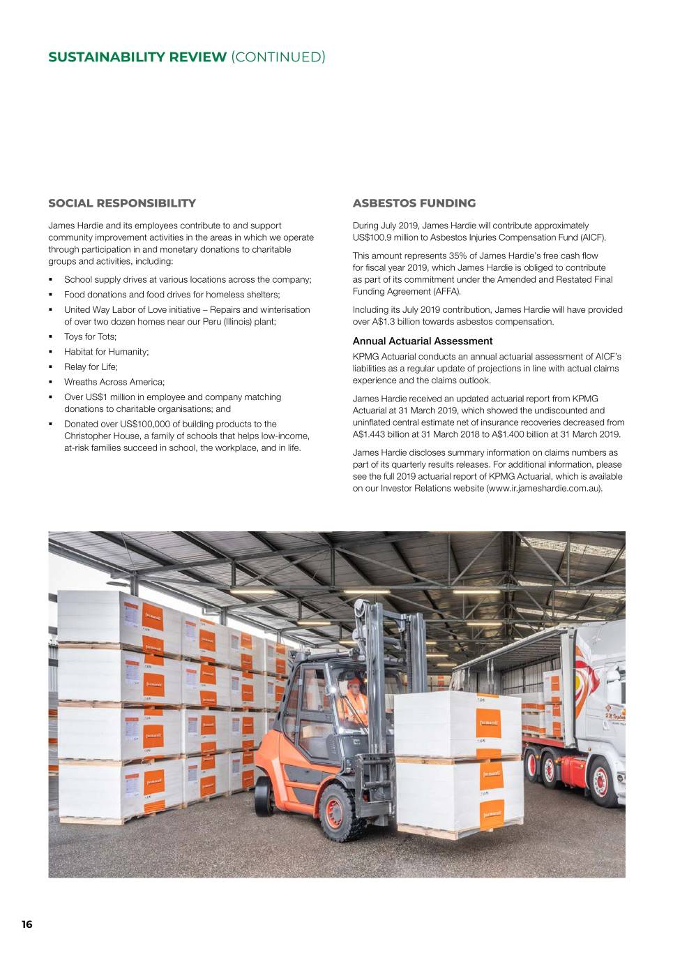 SUSTAINABILITY REVIEW (CONTINUED) SOCIAL RESPONSIBILITY ASBESTOS FUNDING James Hardie and its employees contribute to and support During July 2019, James Hardie will contribute approximately community improvement activities in the areas in which we operate US$100.9 million to Asbestos Injuries Compensation Fund (AICF). through participation in and monetary donations to charitable This amount represents 35% of James Hardie’s free cash flow groups and activities, including: for fiscal year 2019, which James Hardie is obliged to contribute §§ School supply drives at various locations across the company; as part of its commitment under the Amended and Restated Final §§ Food donations and food drives for homeless shelters; Funding Agreement (AFFA). §§ United Way Labor of Love initiative – Repairs and winterisation Including its July 2019 contribution, James Hardie will have provided of over two dozen homes near our Peru (Illinois) plant; over A$1.3 billion towards asbestos compensation. §§ Toys for Tots; Annual Actuarial Assessment §§ Habitat for Humanity; KPMG Actuarial conducts an annual actuarial assessment of AICF’s §§ Relay for Life; liabilities as a regular update of projections in line with actual claims §§ Wreaths Across America; experience and the claims outlook. §§ Over US$1 million in employee and company matching James Hardie received an updated actuarial report from KPMG donations to charitable organisations; and Actuarial at 31 March 2019, which showed the undiscounted and §§ Donated over US$100,000 of building products to the uninflated central estimate net of insurance recoveries decreased from Christopher House, a family of schools that helps low-income, A$1.443 billion at 31 March 2018 to A$1.400 billion at 31 March 2019. at-risk families succeed in school, the workplace, and in life. James Hardie discloses summary information on claims numbers as part of its quarterly results releases. For additional information, please see the full 2019 actuarial report of KPMG Actuarial, which is available on our Investor Relations website (www.ir.jameshardie.com.au). 16