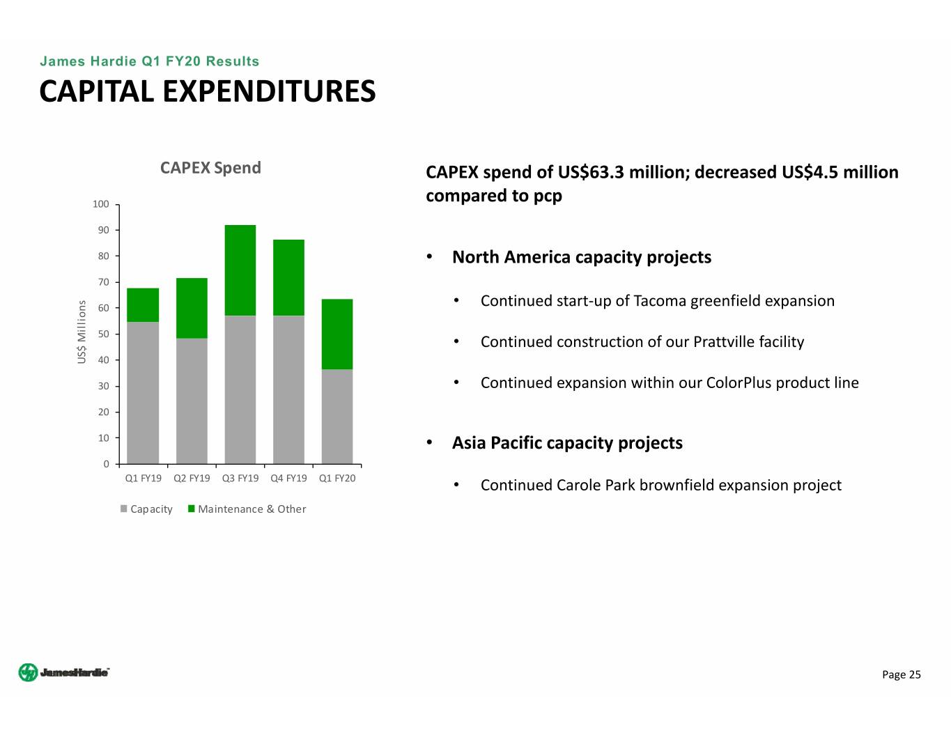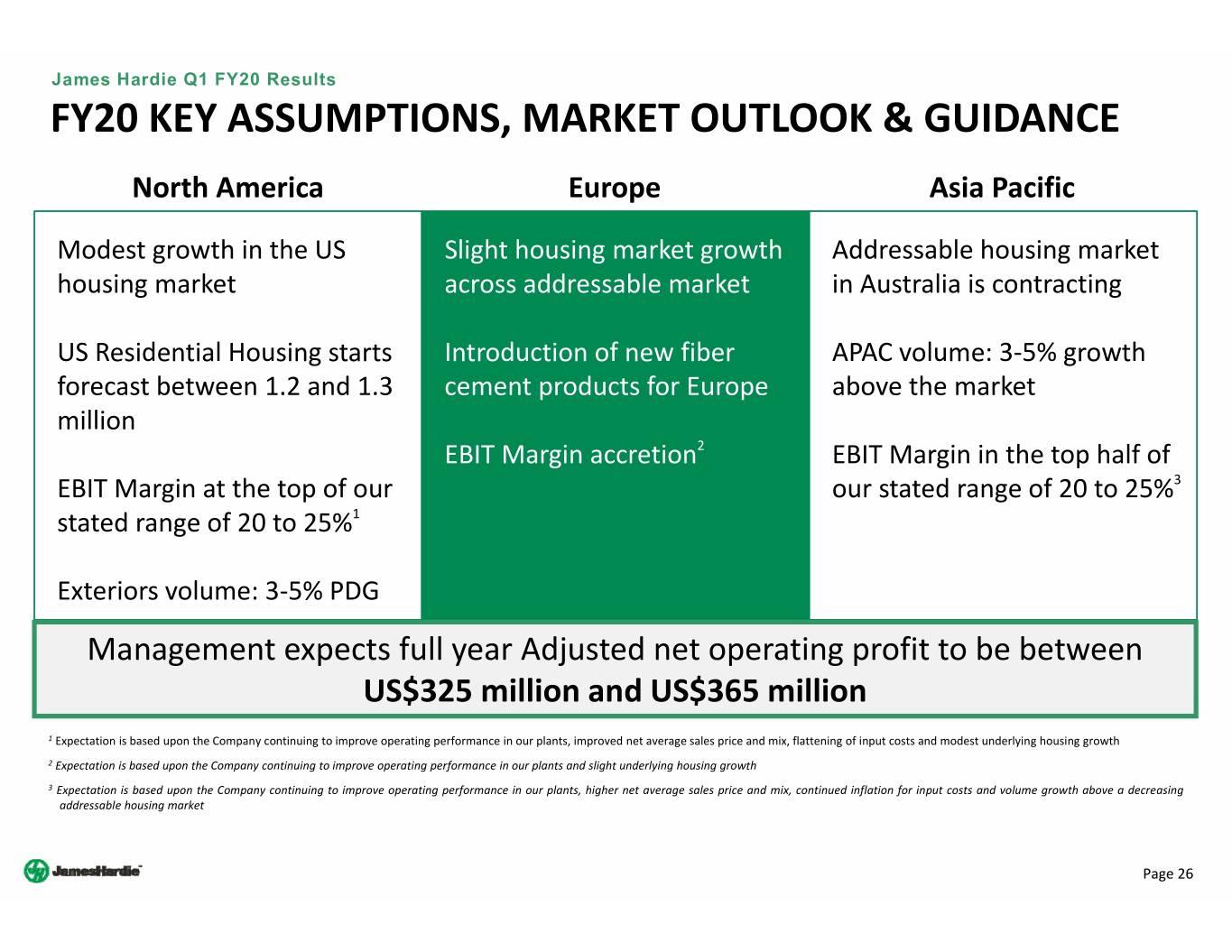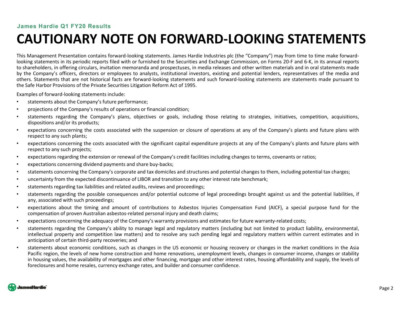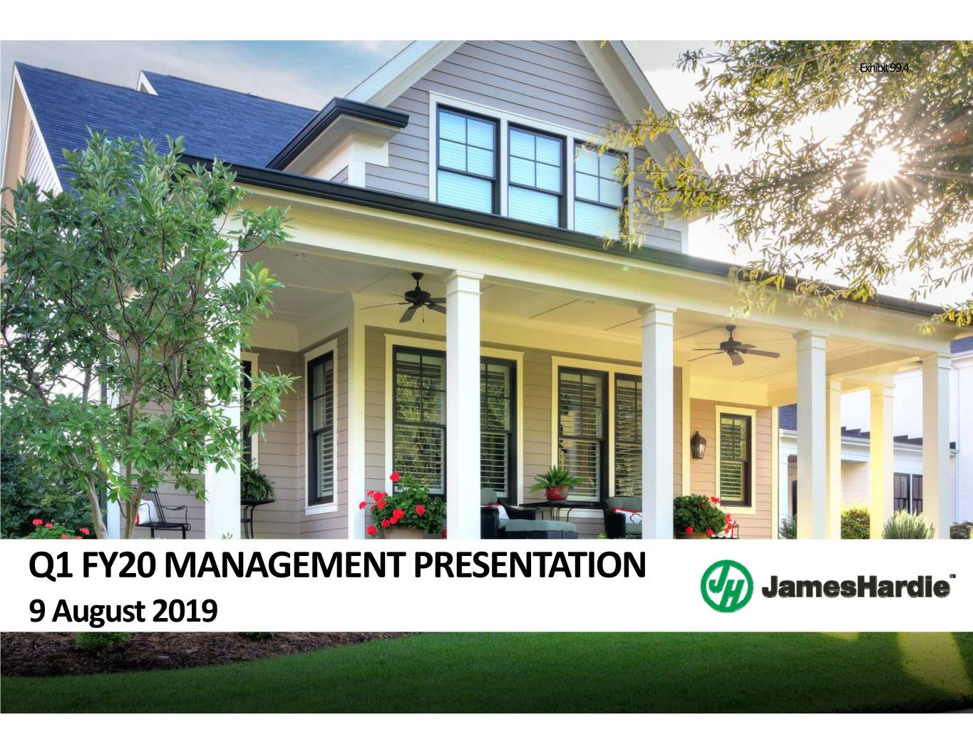 James Hardie Q1 FY20 Results CAUTIONARY NOTE ON FORWARD‐LOOKING STATEMENTS This Management Presentation contains forward‐looking statements. James Hardie Industries plc (the “Company”) may from time to time make forward‐ looking statements in its periodic reports filed with or furnished to the SecuritiesandExchangeCommission,onForms20‐Fand6‐K,initsannualreports to shareholders, in offering circulars, invitation memoranda and prospectuses, in media releases and other written materials and in oral statements made by the Company’s officers, directors or employees to analysts, institutional investors, existing and potential lenders, representatives of the media and others. Statements that are not historical facts are forward‐looking statements and such forward‐looking statements are statements made pursuantto the Safe Harbor Provisions of the Private Securities Litigation Reform Act of 1995. Examples of forward‐looking statements include: • statements about the Company’s future performance; • projections of the Company’s results of operations or financial condition; • statements regarding the Company’s plans, objectives or goals, including those relating to strategies, initiatives, competition, acquisitions, dispositions and/or its products; • expectations concerning the costs associated with the suspension or closure of operations at any of the Company’s plants and future plans with respect to any such plants; • expectations concerning the costs associated with the significant capital expenditure projects at any of the Company’s plants and future plans with respect to any such projects; • expectations regarding the extension or renewal of the Company’s credit facilities including changes to terms, covenants or ratios; • expectations concerning dividend payments and share buy‐backs; • statements concerning the Company’s corporate and tax domiciles and structures and potential changes to them, including potential tax charges; • uncertainty from the expected discontinuance of LIBOR and transition to any other interest rate benchmark; • statements regarding tax liabilities and related audits, reviews and proceedings; • statements regarding the possible consequences and/or potential outcome of legal proceedings brought against us and the potential liabilities, if any, associated with such proceedings; • expectations about the timing and amount of contributions to Asbestos Injuries Compensation Fund (AICF), a special purpose fund for the compensation of proven Australian asbestos‐related personal injury and death claims; • expectations concerning the adequacy of the Company’s warranty provisions and estimates for future warranty‐related costs; • statements regarding the Company’s ability to manage legal and regulatory matters (including but not limited to product liability, environmental, intellectual property and competition law matters) and to resolve any such pending legal and regulatory matters within current estimates and in anticipation of certain third‐party recoveries; and • statements about economic conditions, such as changes in the US economic or housing recovery or changes in the market conditions in the Asia Pacific region, the levels of new home construction and home renovations, unemployment levels, changes in consumer income, changes or stability in housing values, the availability of mortgages and other financing, mortgage and other interest rates, housing affordability and supply, the levels of foreclosures and home resales, currency exchange rates, and builder and consumer confidence. Page 2