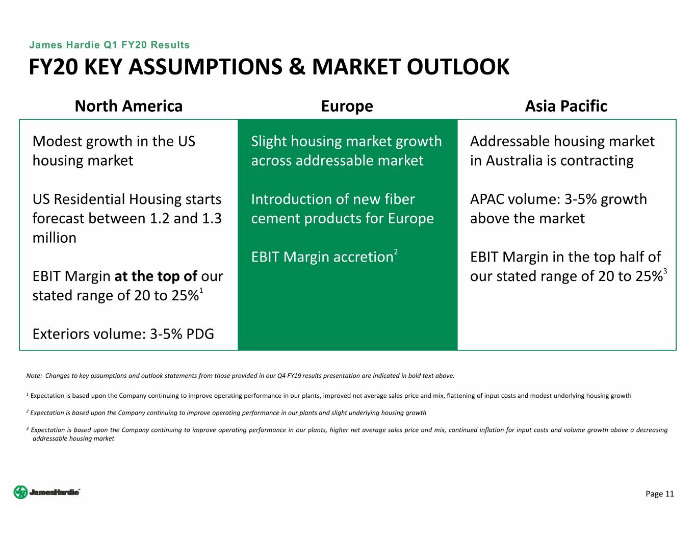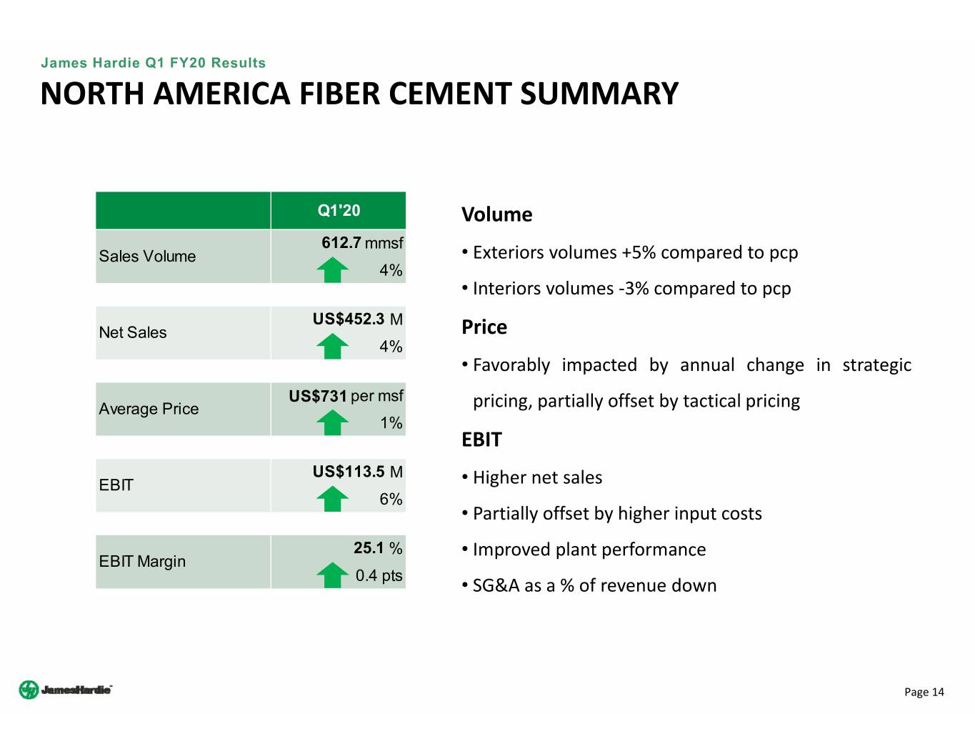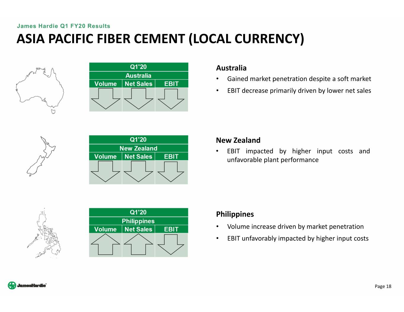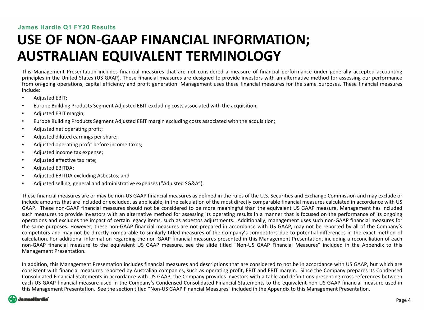 James Hardie Q1 FY20 Results CAUTIONARY NOTE ON FORWARD‐LOOKING STATEMENTS (continued) Words such as “believe,” “anticipate,” “plan,” “expect,” “intend,” “target,” “estimate,” “project,” “predict,” “forecast,” “guideline,” “aim,” “will,” “should,” “likely,” “continue,” “may,” “objective,” “outlook” and similar expressions are intended to identify forward‐looking statements but are not the exclusive means of identifying such statements. Readers are cautioned not to place undue reliance on these forward‐looking statements and all such forward‐looking statements are qualified in their entirety by reference to the following cautionary statements. Forward‐looking statements are based on the Company’s current expectations, estimates and assumptions and because forward‐looking statements address future results, events and conditions, they, by their very nature, involve inherent risks and uncertainties, many of which are unforeseeable and beyond the Company’s control. Such known and unknown risks, uncertainties and other factors may cause actual results, performance or other achievements to differ materially from the anticipated results, performance or achievements expressed, projected or implied by these forward‐looking statements. These factors, some of which are discussed under “Risk Factors”inSection3oftheForm20‐FfiledwiththeSecuritiesandExchange Commission on 21 May 2019 and subsequently amended on 8 August 2019, include, but are not limited to: all matters relating to or arising out of the prior manufacture of products that contained asbestos by current and former Company subsidiaries; required contributions to AICF, any shortfall inAICF and the effect of currency exchange ratemovementsontheamountrecordedin the Company’s financial statements as an asbestos liability; the continuation or termination of the governmental loan facility to AICF; compliance with and changes in tax laws and treatments; competition and product pricing in the markets in which the Company operates; the consequences of product failures or defects; exposure to environmental, asbestos, putative consumer class action or other legal proceedings; general economic and market conditions; the supply and cost of raw materials; possible increases in competition and the potential that competitors could copy the Company’s products; reliance on a small number of customers; a customer’s inability to pay; compliance with and changes in environmental and health and safety laws; risks of conducting business internationally; compliance with and changes in laws and regulations; currency exchange risks; dependence on customer preference and the concentration of the Company’s customer base on large format retail customers, distributors and dealers; dependence on residential and commercial construction markets; the effect of adverse changes in climate or weather patterns; possible inability to renew credit facilities on terms favorable to the Company, or at all; acquisition or sale of businesses and business segments; changes in the Company’s key management personnel; inherent limitations on internal controls; use of accounting estimates; the integration of Fermacell into our business; and all other risks identified in the Company’s reports filed with Australian, Irish and US securities regulatory agencies and exchanges (as appropriate). The Company cautions you that the foregoing list of factors is not exhaustive and that other risks and uncertainties may cause actual results to differ materially from those referenced in the Company’s forward‐looking statements. Forward‐looking statements speak only as of the date they are made and are statements of the Company’s current expectations concerning future results, events and conditions. The Company assumes no obligation to update any forward‐looking statements or information except as required by law. Page 3