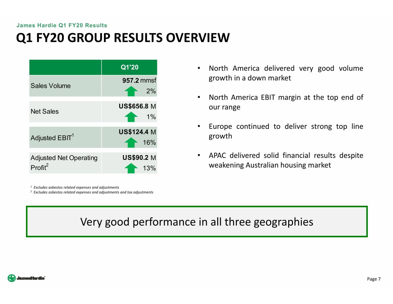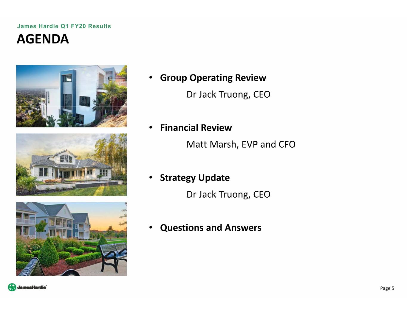 James Hardie Q1 FY20 Results USE OF NON‐GAAP FINANCIAL INFORMATION; AUSTRALIAN EQUIVALENT TERMINOLOGY This Management Presentation includes financial measures that are not considered a measure of financial performance under generally accepted accounting principles in the United States (US GAAP). These financial measures are designed to provide investors with an alternative method for assessing our performance from on‐going operations, capital efficiency and profit generation. Management uses these financial measures for the same purposes. These financial measures include: • Adjusted EBIT; • Europe Building Products Segment Adjusted EBIT excluding costs associated with the acquisition; • Adjusted EBIT margin; • Europe Building Products Segment Adjusted EBIT margin excluding costs associated with the acquisition; • Adjusted net operating profit; • Adjusted diluted earnings per share; • Adjusted operating profit before income taxes; • Adjusted income tax expense; • Adjusted effective tax rate; • Adjusted EBITDA; • Adjusted EBITDA excluding Asbestos; and • Adjusted selling, general and administrative expenses (“Adjusted SG&A”). These financial measures are or may be non‐US GAAP financial measures as definedintherulesoftheU.S.SecuritiesandExchangeCommissionandmayexclude or include amounts that are included or excluded, as applicable, in the calculation of the most directly comparable financial measures calculated in accordance with US GAAP. These non‐GAAP financial measures should not be considered to be more meaningful than the equivalent US GAAP measure. Management has included such measures to provide investors with an alternative method for assessing its operating results in a manner that is focused on the performance of its ongoing operations and excludes the impact of certain legacy items, such as asbestos adjustments. Additionally, management uses such non‐GAAP financial measures for the same purposes. However, these non‐GAAP financial measures are not prepared in accordance with US GAAP, may not be reported by all of the Company’s competitors and may not be directly comparable to similarly titled measures of the Company’s competitors due to potential differences in the exact method of calculation. For additional information regarding the non‐GAAP financial measures presented in this Management Presentation, including a reconciliation of each non‐GAAP financial measure to the equivalent US GAAP measure, see the slide titled “Non‐US GAAP Financial Measures” included in the Appendix to this Management Presentation. In addition, this Management Presentation includes financial measures and descriptions that are considered to not be in accordance with US GAAP, butwhichare consistent with financial measures reported by Australian companies, such as operating profit, EBIT and EBIT margin. Since the Company prepares its Condensed Consolidated Financial Statements in accordance with US GAAP, the Company provides investors with a table and definitions presenting cross‐references between each US GAAP financial measure used in the Company’s Condensed Consolidated Financial Statements to the equivalent non‐US GAAP financial measure used in this Management Presentation. See the section titled “Non‐US GAAP Financial Measures” included in the Appendix to this Management Presentation. Page 4