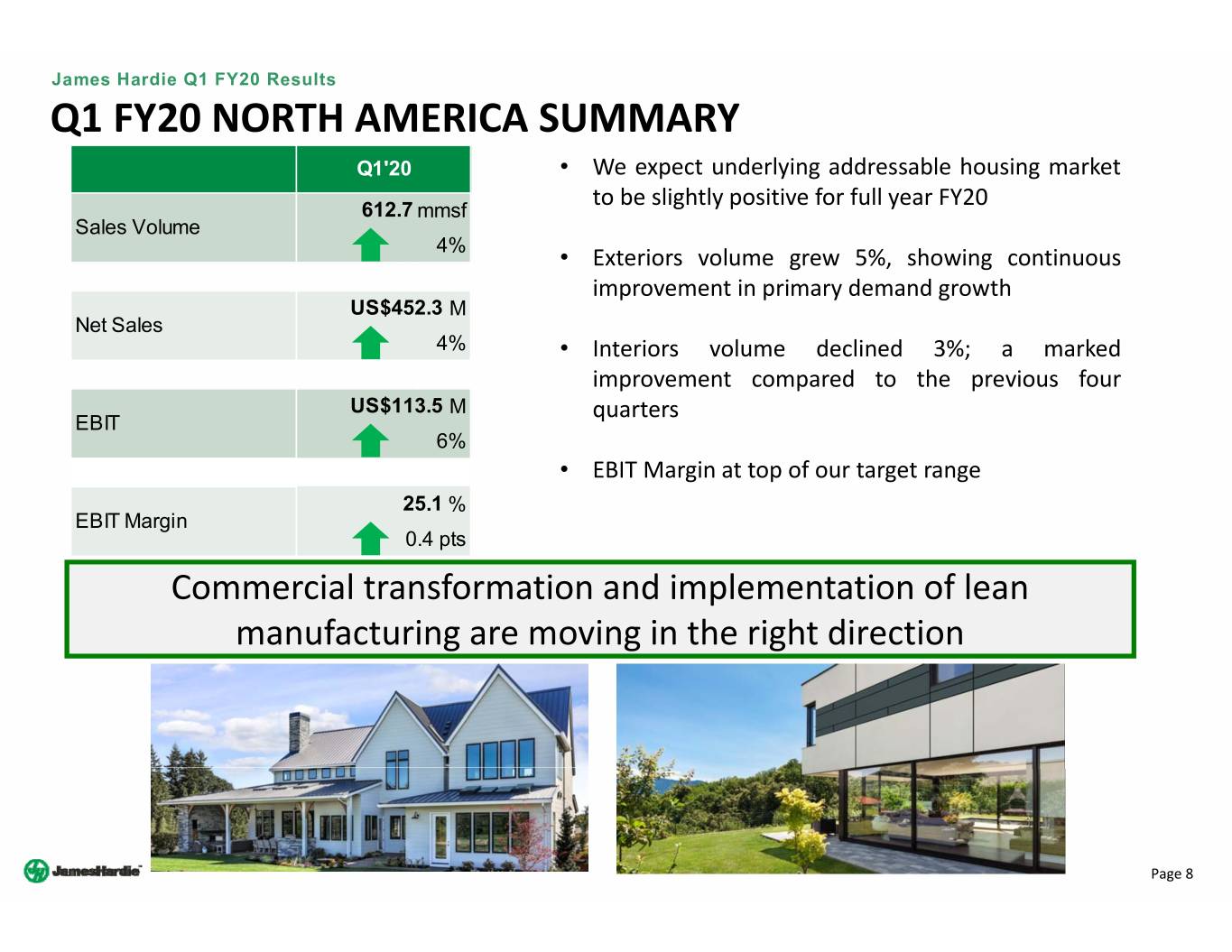 James Hardie Q1 FY20 Results Q1 FY20 GROUP RESULTS OVERVIEW Q1'20 • North America delivered very good volume 957.2 mmsf growth in a down market Sales Volume 2% • North America EBIT margin at the top end of US$656.8 M our range Net Sales 1% • Europe continued to deliver strong top line US$124.4 M Adjusted EBIT1 growth 16% Adjusted Net Operating US$90.2 M • APAC delivered solid financial results despite Profit2 13% weakening Australian housing market 1 Excludes asbestos related expenses and adjustments 2 Excludes asbestos related expenses and adjustments and tax adjustments Very good performance in all three geographies Page 7