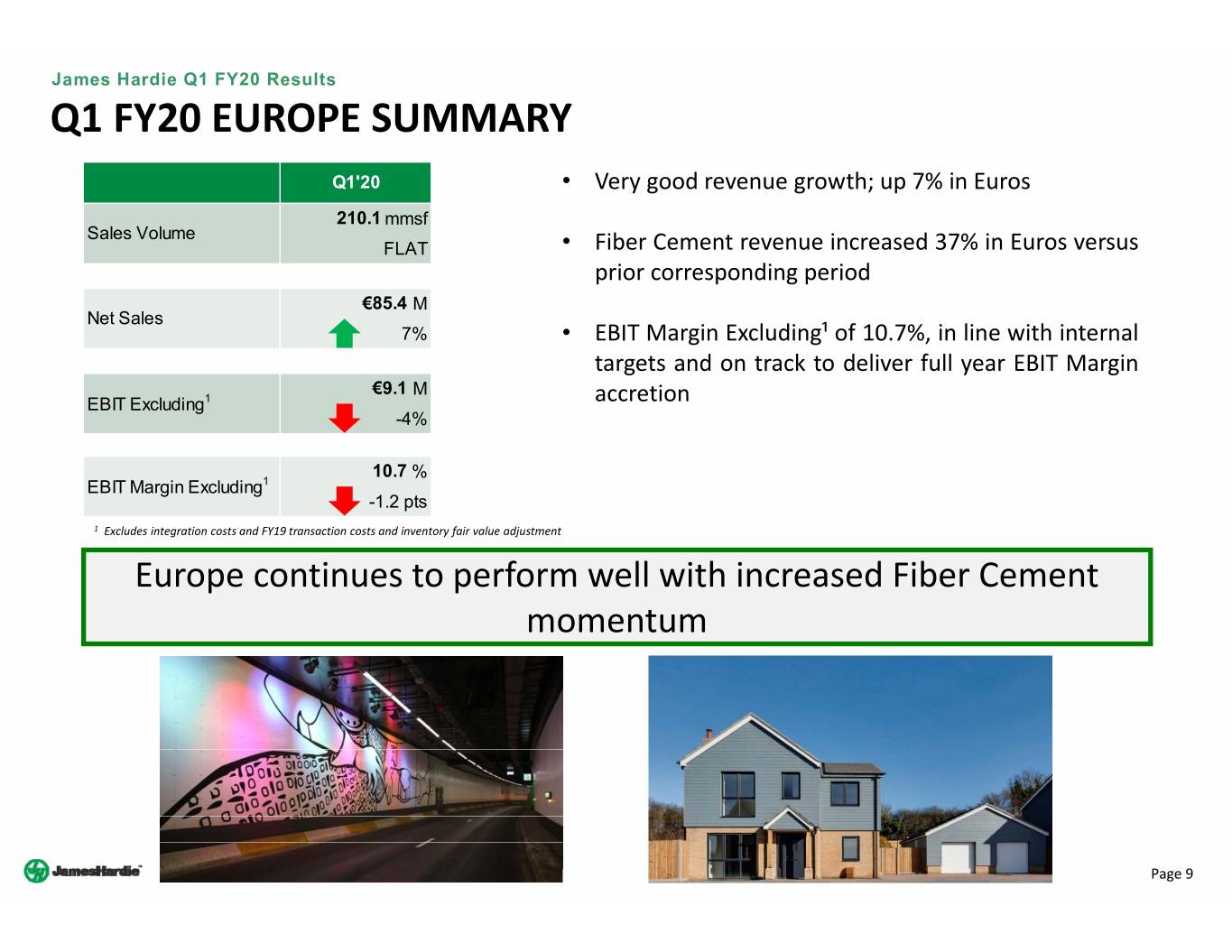 James Hardie Q1 FY20 Results Q1 FY20 NORTH AMERICA SUMMARY Q1'20 • We expect underlying addressable housing market to be slightly positive for full year FY20 612.7 mmsf Sales Volume 4% • Exteriors volume grew 5%, showing continuous improvement in primary demand growth US$452.3 M Net Sales 4% • Interiors volume declined 3%; a marked improvement compared to the previous four US$113.5 M quarters EBIT 6% • EBIT Margin at top of our target range 25.1 % EBIT Margin 0.4 pts Commercial transformation and implementation of lean manufacturing are moving in the right direction Page 8