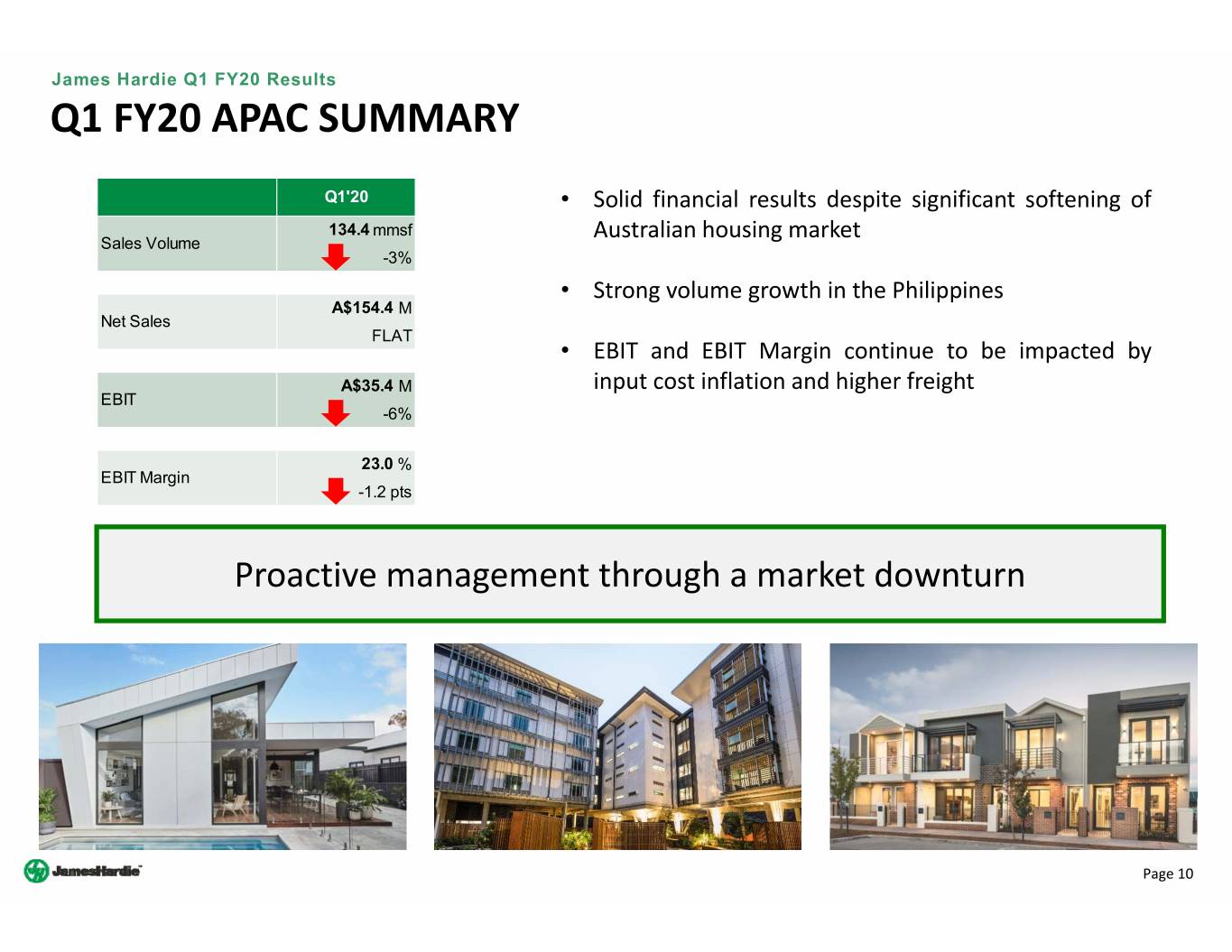James Hardie Q1 FY20 Results Q1 FY20 EUROPE SUMMARY Q1'20 • Very good revenue growth; up 7% in Euros 210.1 mmsf Sales Volume FLAT • Fiber Cement revenue increased 37% in Euros versus prior corresponding period €85.4 M Net Sales 7% • EBIT Margin Excluding¹ of 10.7%, in line with internal targets and on track to deliver full year EBIT Margin €9.1 M EBIT Excluding1 accretion -4% 10.7 % EBIT Margin Excluding1 -1.2 pts 1 Excludes integration costs and FY19 transaction costs and inventory fair value adjustment Europe continues to perform well with increased Fiber Cement momentum Page 9