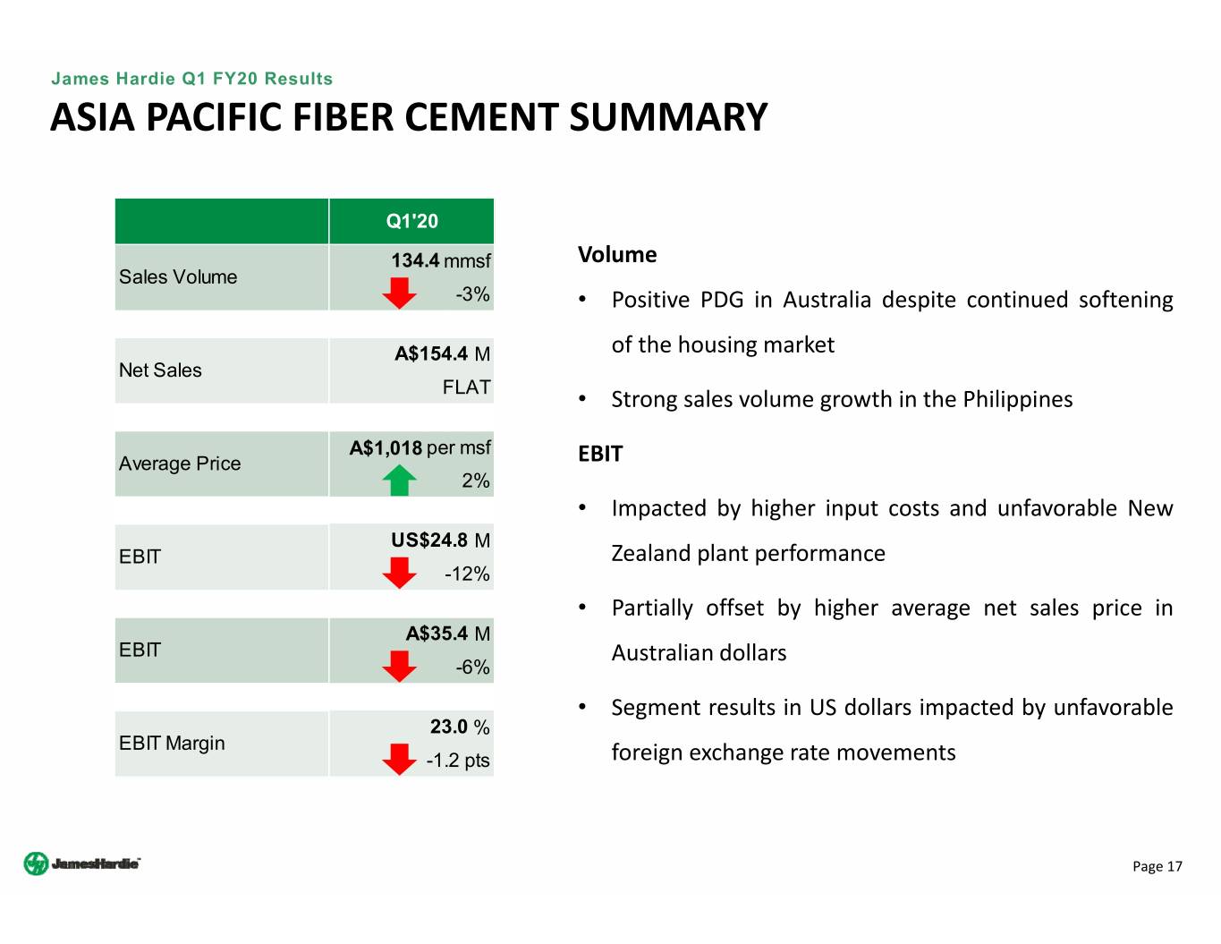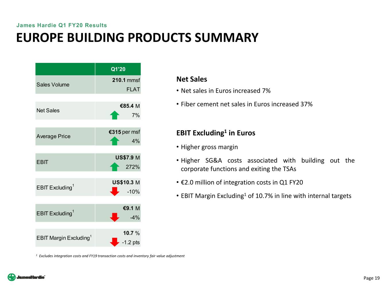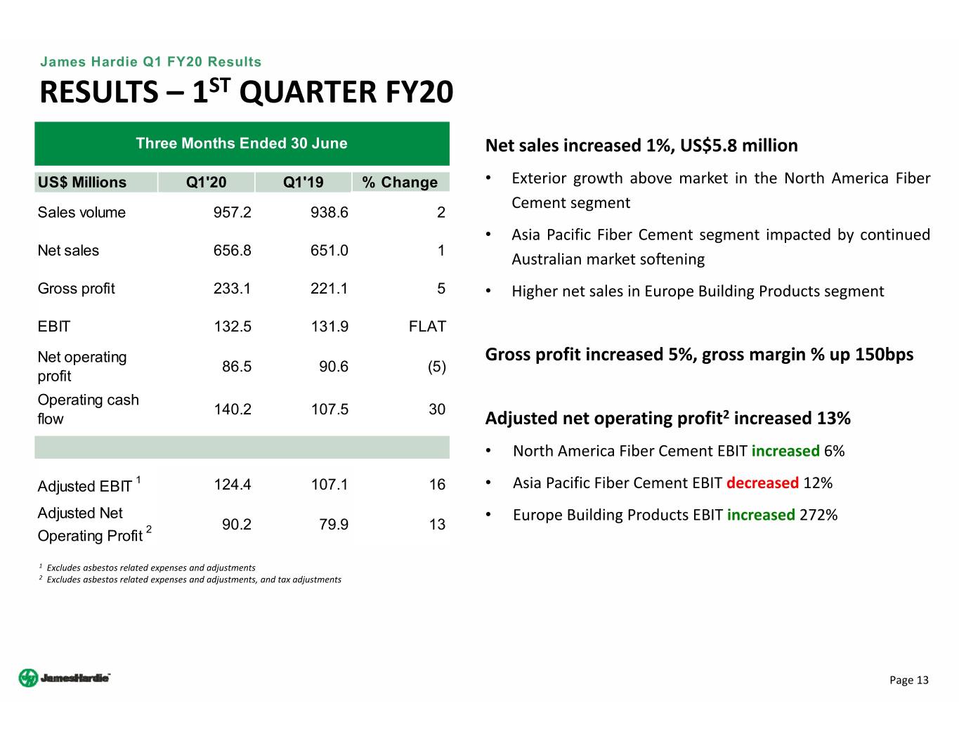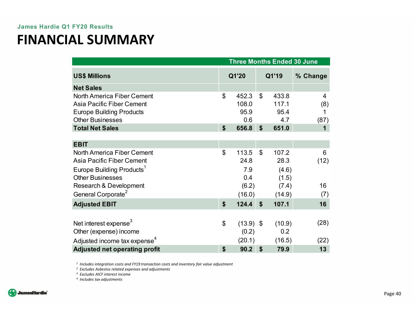 James Hardie Q1 FY20 Results FINANCIAL SUMMARY Three Months Ended 30 June US$ Millions Q1'20 Q1'19 % Change Net Sales North America Fiber Cement$ 452.3 $ 433.8 4 Asia Pacific Fiber Cement 108.0 117.1 (8) Europe Building Products 95.9 95.4 1 Other Businesses 0.6 4.7 (87) Total Net Sales$ 656.8 $ 651.0 1 EBIT North America Fiber Cement$ 113.5 $ 107.2 6 Asia Pacific Fiber Cement 24.8 28.3 (12) Europe Building Products1 7.9 (4.6) Other Businesses 0.4 (1.5) Research & Development (6.2) (7.4) 16 General Corporate2 (16.0) (14.9) (7) Adjusted EBIT$ 124.4 $ 107.1 16 Net interest expense3 $ (13.9) $ (10.9) (28) Other (expense) income (0.2) 0.2 Adjusted income tax expense4 (20.1) (16.5) (22) Adjusted net operating profit$ 90.2 $ 79.9 13 1 Includes integration costs and FY19 transaction costs and inventory fair value adjustment 2 Excludes Asbestos related expenses and adjustments 3 Excludes AICF interest income 4 Includes tax adjustments Page 40