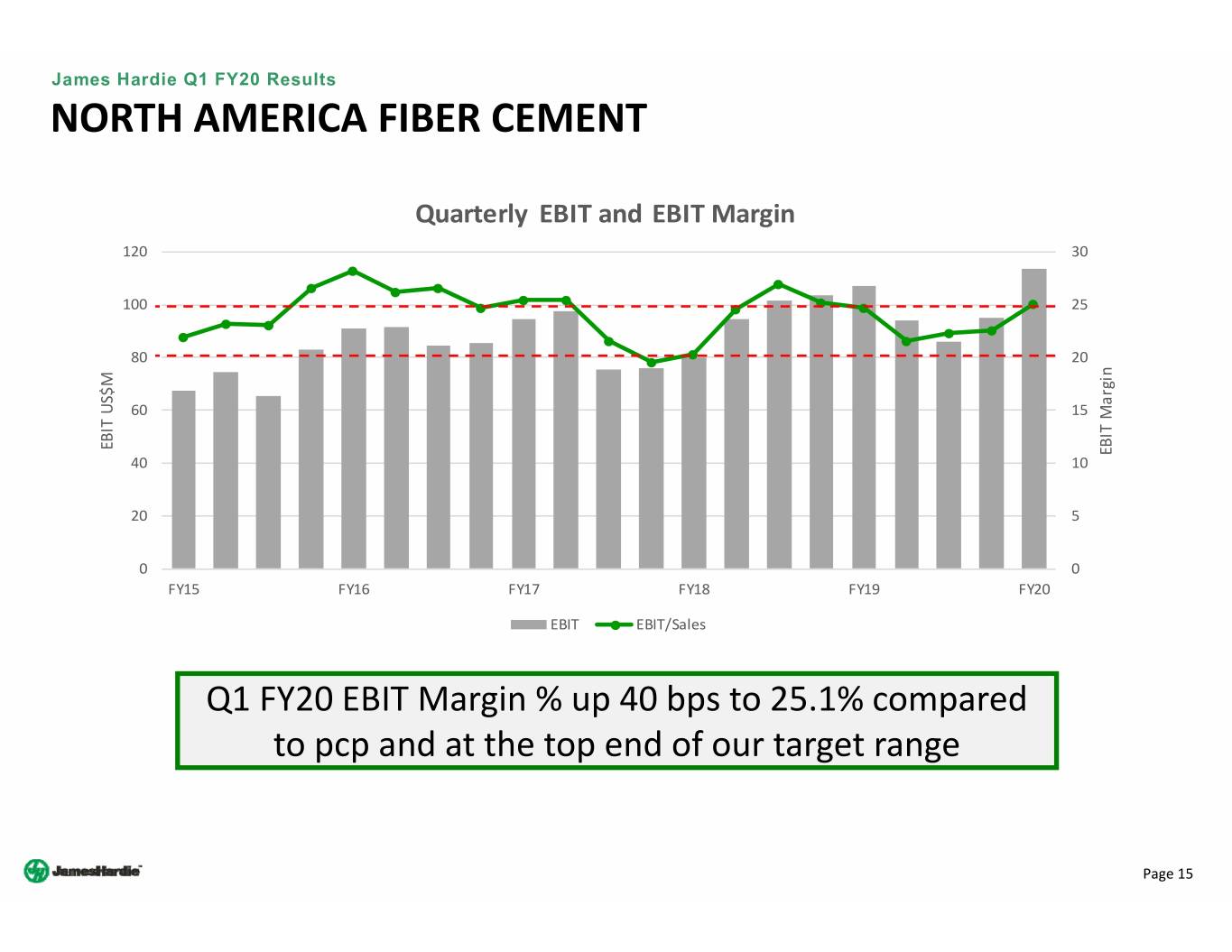 James Hardie Q1 FY20 Results NORTH AMERICA FIBER CEMENT SUMMARY Q1'20 Volume 612.7 mmsf Sales Volume • Exteriors volumes +5% compared to pcp 4% • Interiors volumes ‐3% compared to pcp US$452.3 M Net Sales Price 4% • Favorably impacted by annual change in strategic US$731 per msf Average Price pricing, partially offset by tactical pricing 1% EBIT US$113.5 M EBIT • Higher net sales 6% • Partially offset by higher input costs 25.1 % • Improved plant performance EBIT Margin 0.4 pts • SG&A as a % of revenue down Page 14