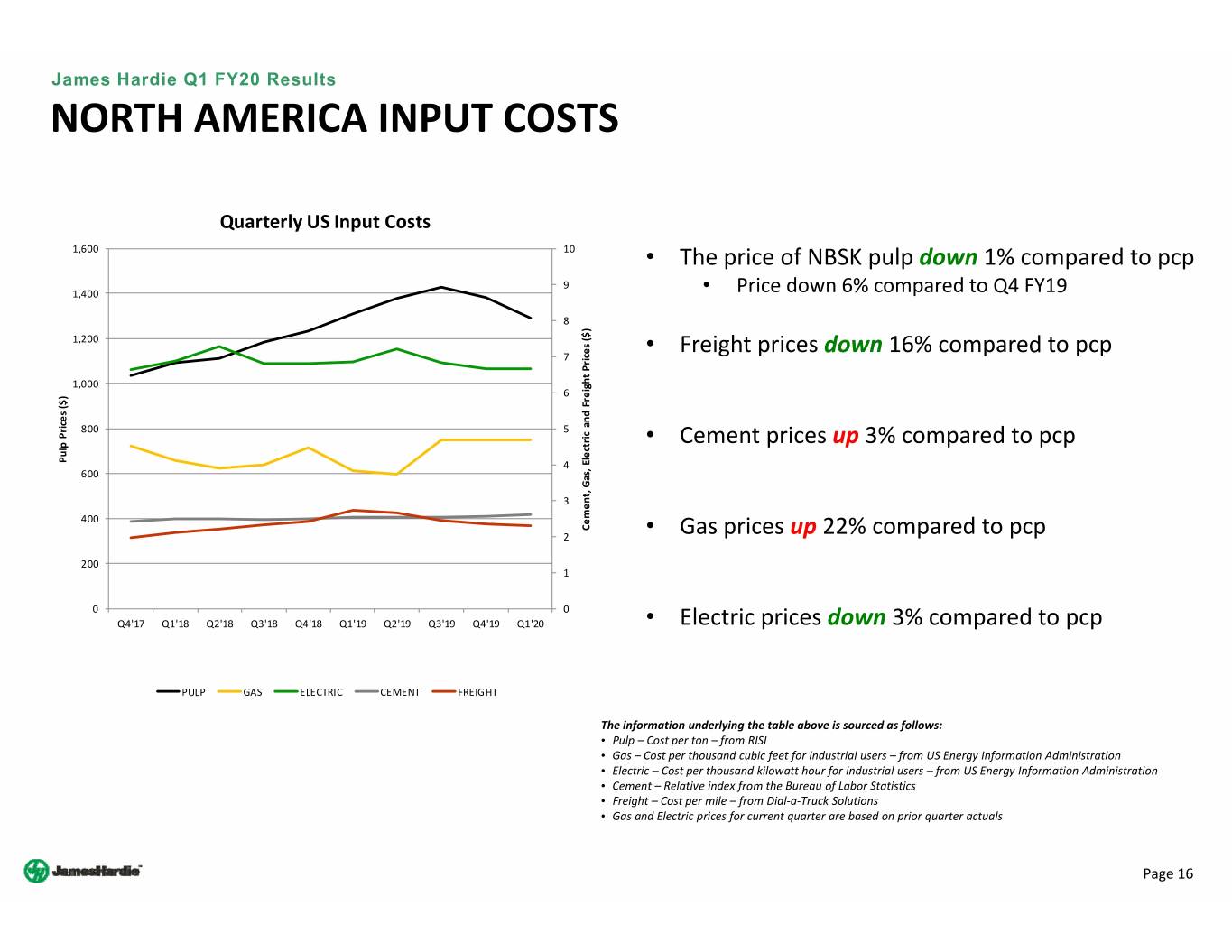 James Hardie Q1 FY20 Results NORTH AMERICA INPUT COSTS Quarterly US Input Costs 1,600 10 • The price of NBSK pulp down 1% compared to pcp 9 1,400 • Price down 6% compared to Q4 FY19 8 1,200 • 7 Freight prices down 16% compared to pcp 1,000 6 800 5 • Cement prices up 3% compared to pcp Pulp Prices ($) 4 600 3 400 Cement, Gas, Electric and Freight Prices ($) 2 • Gas prices up 22% compared to pcp 200 1 0 0 Q4'17 Q1'18 Q2'18 Q3'18 Q4'18 Q1'19 Q2'19 Q3'19 Q4'19 Q1'20 • Electric prices down 3% compared to pcp PULP GAS ELECTRIC CEMENT FREIGHT The information underlying the table above is sourced as follows: • Pulp – Cost per ton – from RISI • Gas – Cost per thousand cubic feet for industrial users – from US Energy Information Administration • Electric – Cost per thousand kilowatt hour for industrial users – from US Energy Information Administration • Cement – Relative index from the Bureau of Labor Statistics • Freight – Cost per mile – from Dial‐a‐Truck Solutions • Gas and Electric prices for current quarter are based on prior quarter actuals Page 16