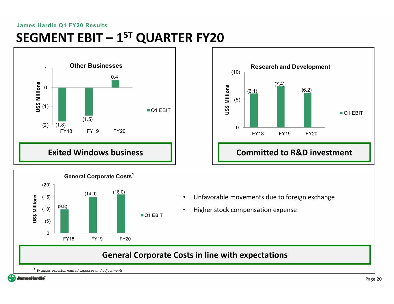 James Hardie Q1 FY20 Results SEGMENT EBIT – 1ST QUARTER FY20 Other Businesses 1 Research and Development (10) 0.4 (7.4) 0 (6.1) (6.2) (5) (1) US$ Millions US$ Q1 EBIT US$ Millions US$ Q1 EBIT (1.5) (2) (1.8) 0 FY18 FY19 FY20 FY18 FY19 FY20 Exited Windows business Committed to R&D investment General Corporate Costs1 (20) (14.9) (16.0) (15) • Unfavorable movements due to foreign exchange (9.8) (10) • Higher stock compensation expense Q1 EBIT US$ Millions US$ (5) 0 FY18 FY19 FY20 General Corporate Costs in line with expectations 1 Excludes asbestos related expenses and adjustments Page 20