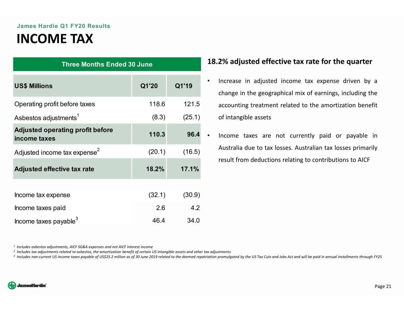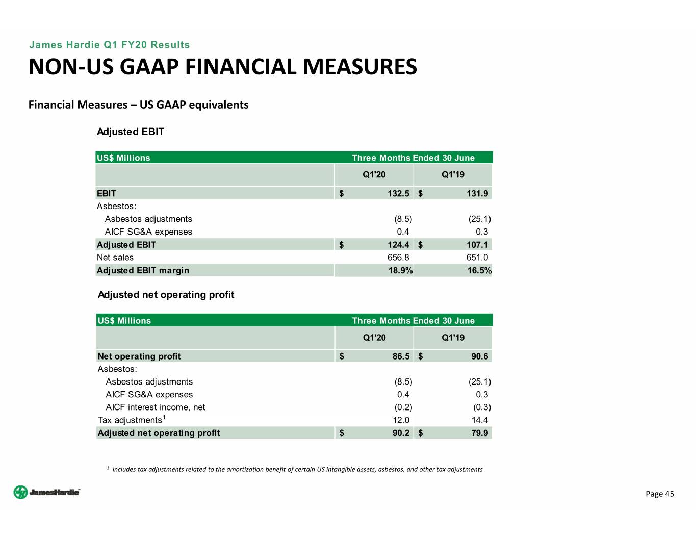 James Hardie Q1 FY20 Results NON‐US GAAP FINANCIAL MEASURES Financial Measures – US GAAP equivalents This document contains financial statement line item descriptions that are considered to be non‐US GAAP, but are consistent with those used by Australian companies. Because the company prepares its Condensed Consolidated Financial Statements under US GAAP, the following table cross‐ references each non‐US GAAP line item description, as used in Management’s Analysis of Results and Media Release, to the equivalent US GAAP financial statement line item description used in the company’s Condensed Consolidated Financial Statements: Management's Analysis of Results and Consolidated Statements of Operations Media Release and Other Comprehensive Income (Loss) (US GAAP) Net sales Net sales Cost of goods sold Cost of goods sold Gross profit Gross profit Selling, general and administrative expenses Selling, general and administrative expenses Research and development expenses Research and development expenses Asbestos adjustments Asbestos adjustments EBIT* Operating income (loss) Net interest income (expense)* Sum of interest expense and interest income Other income (expense) Other income (expense) Operating profit (loss) before income taxes* Income (loss) before income taxes Income tax (expense) benefit Income tax (expense) benefit Net operating profit (loss)* Net income (loss) *- Represents non-US GAAP descriptions used by Australian companies. Page 44