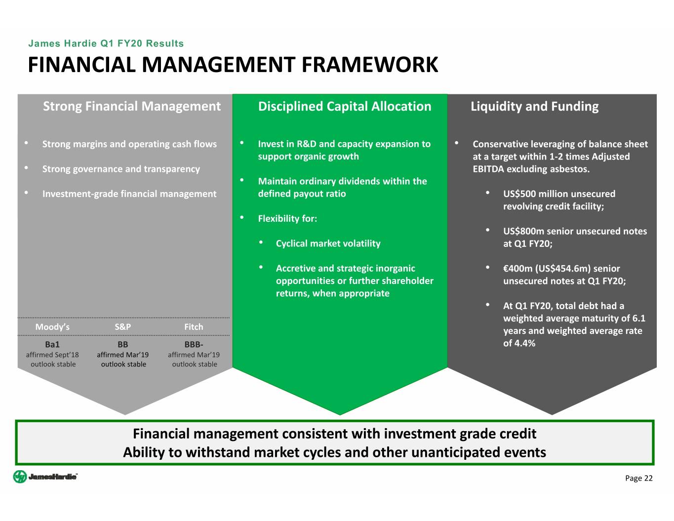 James Hardie Q1 FY20 Results FINANCIAL MANAGEMENT FRAMEWORK Strong Financial Management Disciplined Capital Allocation Liquidity and Funding • Strong margins and operating cash flows • Invest in R&D and capacity expansion to • Conservative leveraging of balance sheet support organic growth at a target within 1‐2 times Adjusted • Strong governance and transparency EBITDA excluding asbestos. • Maintain ordinary dividends within the • Investment‐grade financial management defined payout ratio • US$500 million unsecured revolving credit facility; • Flexibility for: • US$800m senior unsecured notes • Cyclical market volatility at Q1 FY20; • Accretive and strategic inorganic • €400m (US$454.6m) senior opportunities or further shareholder unsecured notes at Q1 FY20; returns, when appropriate • At Q1 FY20, total debt had a weighted average maturity of 6.1 Moody’s S&P Fitch years and weighted average rate Ba1 BB BBB‐ of 4.4% affirmed Sept’18 affirmed Mar’19 affirmed Mar’19 outlook stable outlook stable outlook stable Financial management consistent with investment grade credit Ability to withstand market cycles and other unanticipated events Page 22